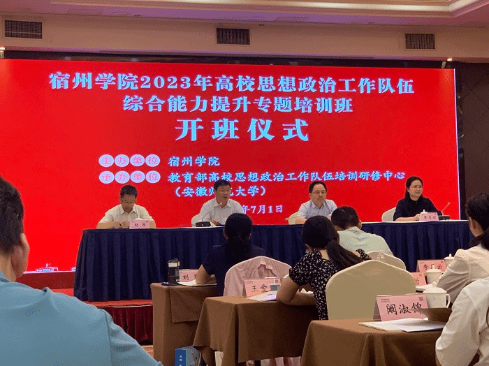 7月1日,中国共产党迎来建党102周年,由宿州学院主办,教育部高校思想政治工作队伍培训研修中心(安徽师范大学)承办的宿州学院2023年高校思想政治工作队伍综合能力提升专题培训开班仪式在芜湖海螺国际大酒店举行。院党委委员、纪委书记、监察专员王俊,安徽师范大学马克思主义学院院长、教育部高校思想政治工作队伍培训研修中心(安徽师范大学)办公室主任、《高校辅导员学刊》编辑部主任姚宏志教授,宿州学院学工部部长李月云,学工部相关工作人员及60余名辅导员参加开班仪式。仪式由安徽师范大学马克思主义学院副院长、教育部高校思想政治工作队伍培训研修中心(安徽师范大学)办公室副主任赵冰主持。