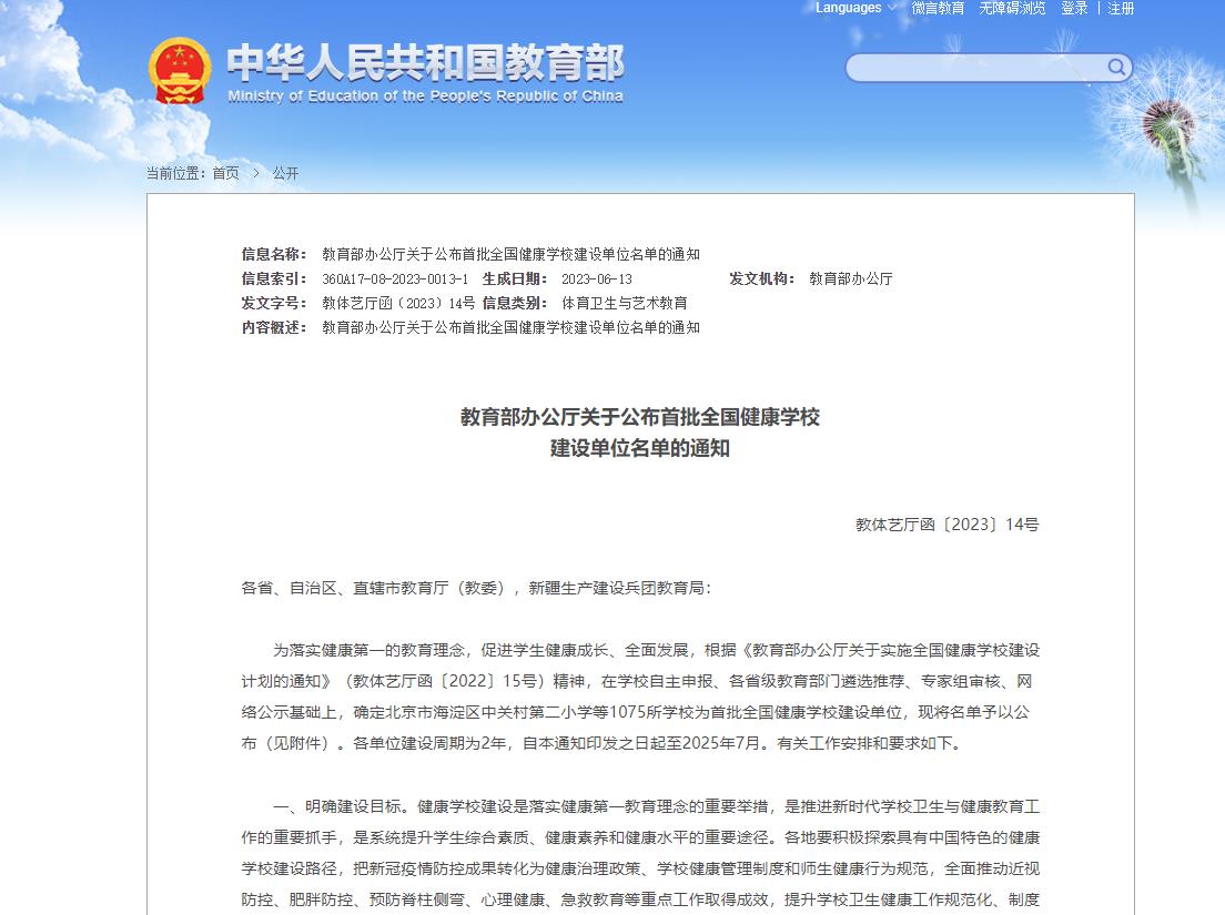 近日,根据教育部最新发布的通知,我院获批全国首批健康学校建设单位。2022年4月,教育部启动了全国健康学校建设计划,由学校自主申报、各省级教育部门遴选推荐,经教育部组织专家审核,全国共有1075所各级各类学校入选首批全国健康学校建设单位,安徽省共有55所学校入选,我院入选其中。