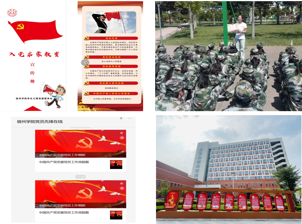 用好“三大载体”,提升教育质效。为进一步引导和帮助广大新生了解党的基本知识、理论和入党程序,端正入党动机,树立正确的世界观、人生观和价值观,党委组织部创新载体形式,提升入党启蒙教育质效。制作入党启蒙宣传页,学生党建服务中心学生到军训现场开展宣讲活动;在宿州学院党员先锋在线公众号上发布中国共产党发展党员工作细则、中国共产党发展党员工作流程图等信息;在党建文化主题广场宣传栏举办“身边的榜样”学生党员典型事迹风采展,一批勤学上进、科研竞赛、学术工作、志愿服务、社会实践、创新创业等方面取得优异成绩的学生党员事迹,作为入党启蒙的“鲜活教材”,展现了宿州学院优秀学生党员的风采,让新生感受“党员在服务,榜样在身边”,新生观看后纷纷表示要向榜样学习,争取早日加入中国共产党。