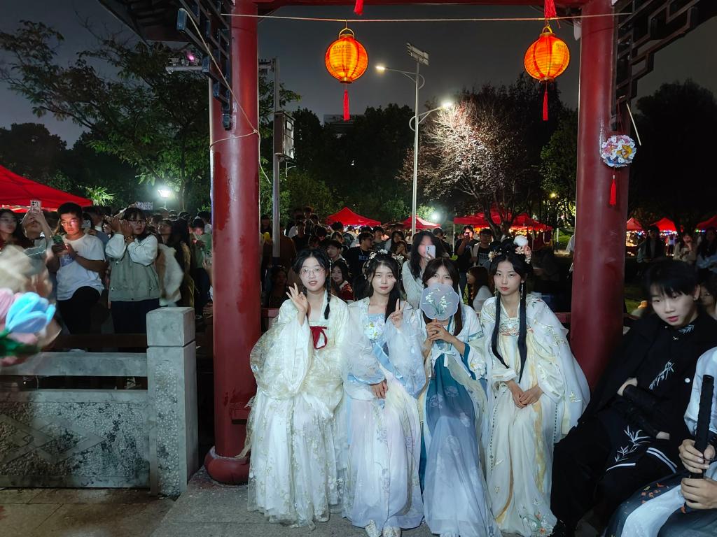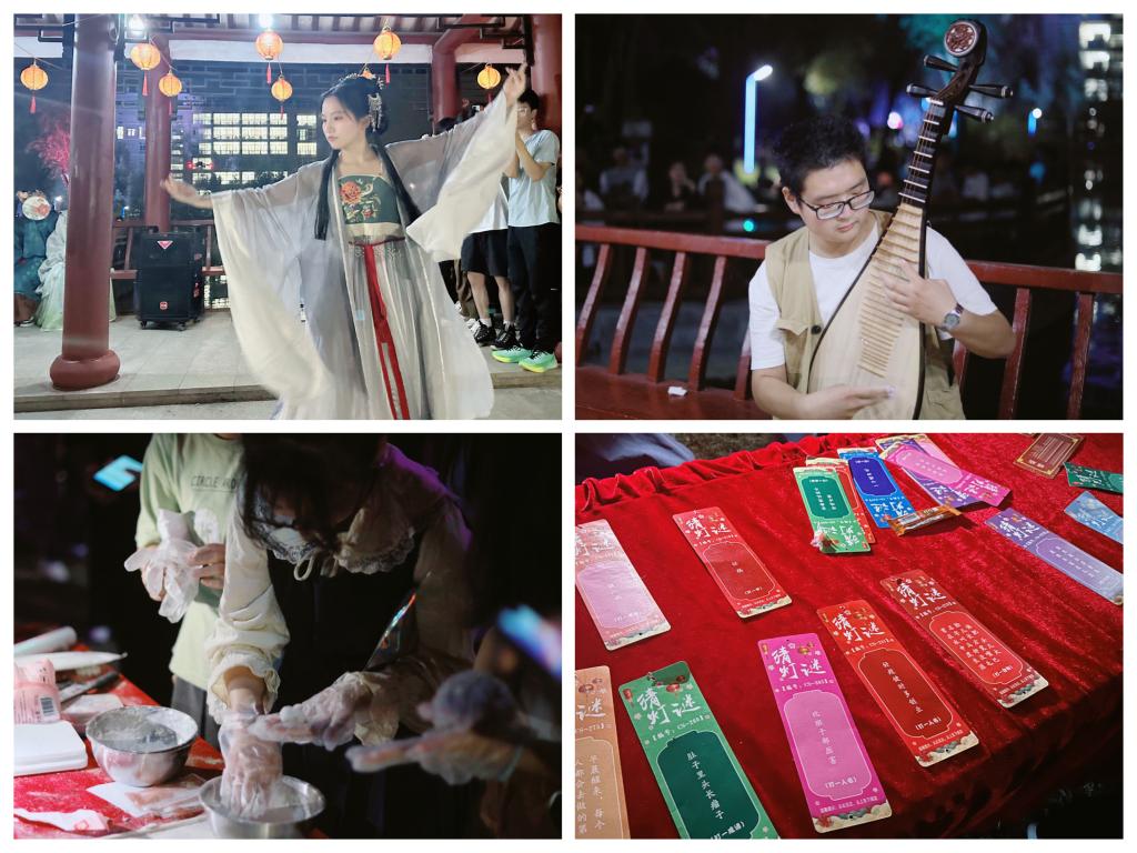 夜色渐起,华灯齐放。听洋洋盈耳的歌声,看矫若惊龙的舞蹈,天籁吉他社的“唱响中秋”与街舞俱乐部的“舞动中秋”上演了一场浩浩汤汤的“中秋音乐舞蹈节”,学子们汇聚于此,尽情享受了一场秋之盛典!国学协会的成员“淡淡梳妆薄薄衣,天仙模样好容仪”,古筝表演、汉服游园、花灯手工……无不吸引着来游玩的学子们驻足欣赏。