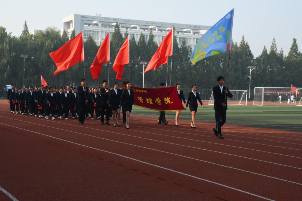 国旗护卫队高举鲜艳的五星红旗,迈着铿锵有力的步伐走进田径场,拉开了运动会的序幕。各方阵踏着矫健的步伐依次入场,同学们精神抖擞,神采飞扬,伴随着嘹亮的口号走过主席台,展现了我院学子积极向上、朝气蓬勃的精神面貌。