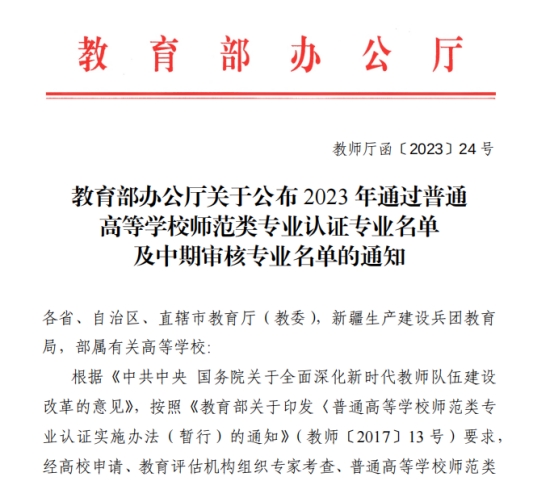 近日,教育部正式发布了《教育部办公厅关于公布2023年通过普通高等学校师范类专业认证专业名单及通过中期审核专业名单的通知》,我院英语专业通过了教育部师范类专业中学教育第二级认证,认证结论有效期六年,自2023年9月起至2029年8月止。根据教育部《普通高等学校师范类专业认证实施办法(暂行)》文件规定,通过二级认证的专业在认证结论有效期内入学的师范生,可由高校自行组织中小学教师资格考试面试工作。