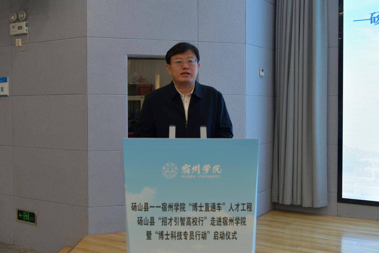 为全面学习贯彻党的二十大精神和省市人才工作大会精神,巩固深化学习贯彻习近平新时代中国特色社会主义思想主题教育成果,持续推动宿州市“4510”校地联合科创行动,深化砀山县--宿州学院“博士直通车”人才工程,10月27日上午,砀山县—宿州学院“博士直通车”人才工程—砀山县“招才引智高校行”走进宿州学院暨“博士科技专员行动”启动仪式在学院教育园区成功举办。宿州学院党委书记李红致辞,砀山县委书记唐明致辞,宿州学院党委副书记王俊主持。砀山县委、县政府、县政协相关领导,县相关部门、相关企业负责同志参加活动。宿州学院全体校领导,组织部、宣传部、办公室、科研处、人事处、团委等相关部门负责同志,二级学院院长、相关二级学院科研副院长、博士代表,创业园有关项目负责人参加活动。