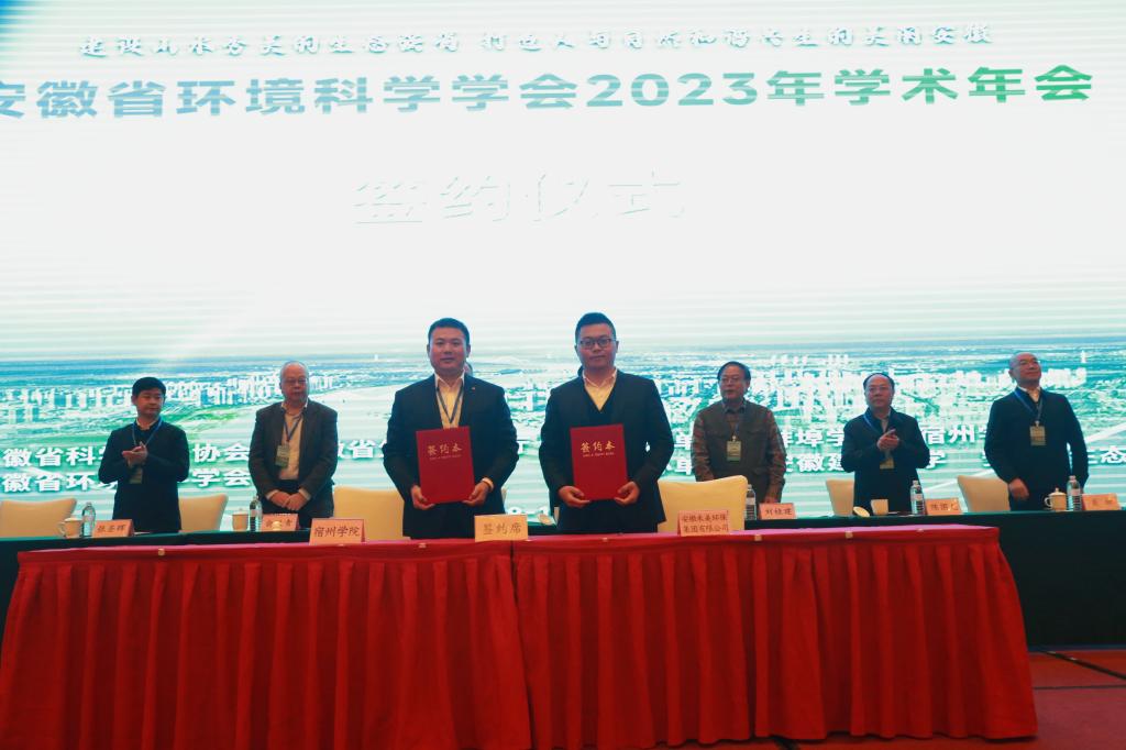 大会现场,宿州学院、安徽建筑大学、蚌埠学院还分别与安徽禾美环保集团有限公司、安徽环境科技集团股份有限公司、安徽宝绿光电工程有限公司、安徽省徽商环境资源再生科技有限公司签订了产学研合作协议。