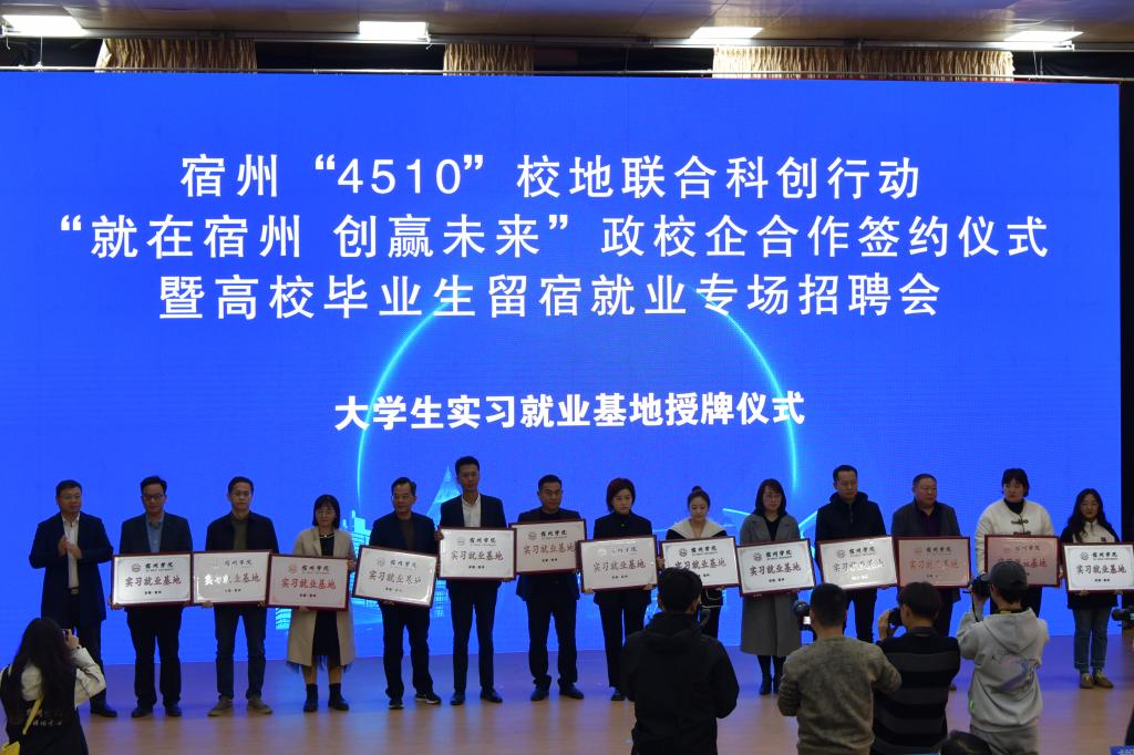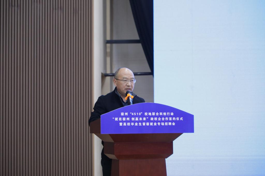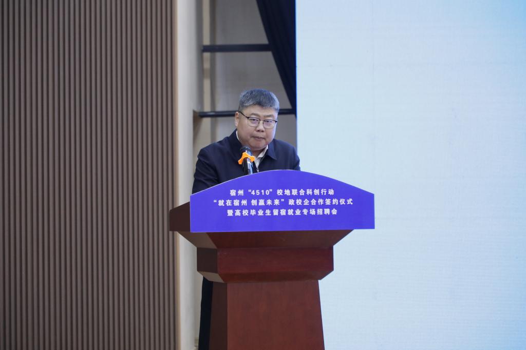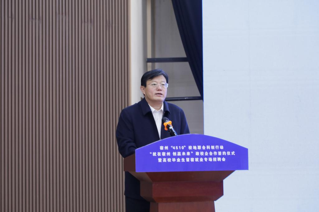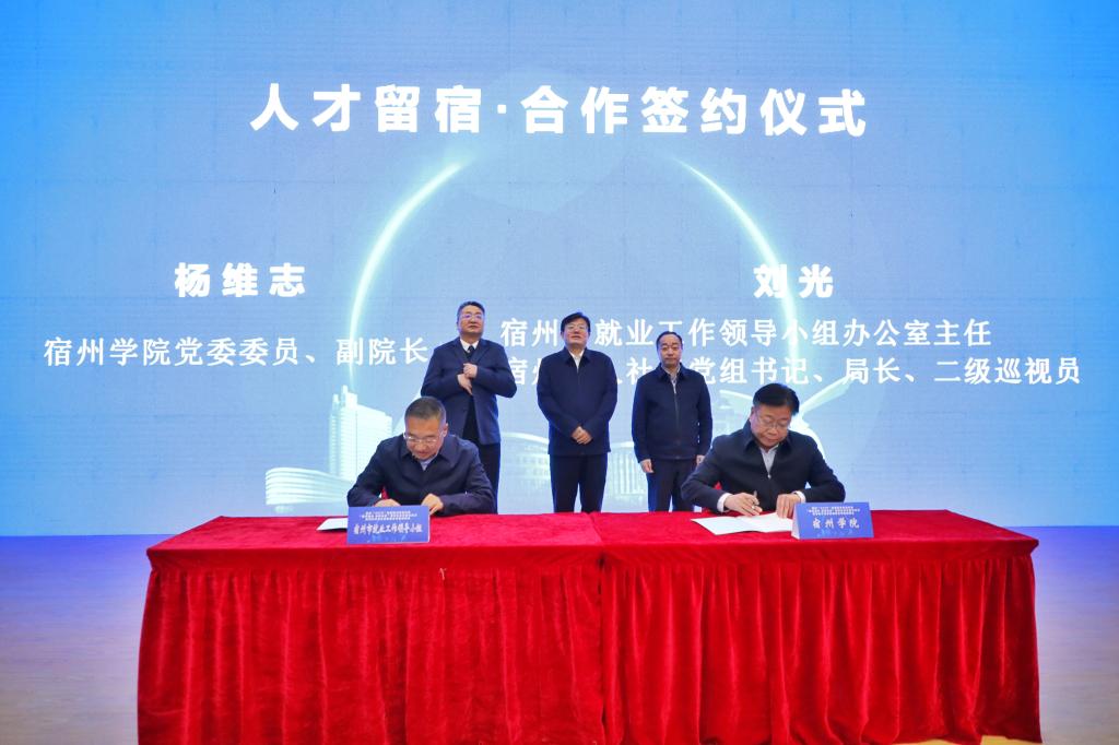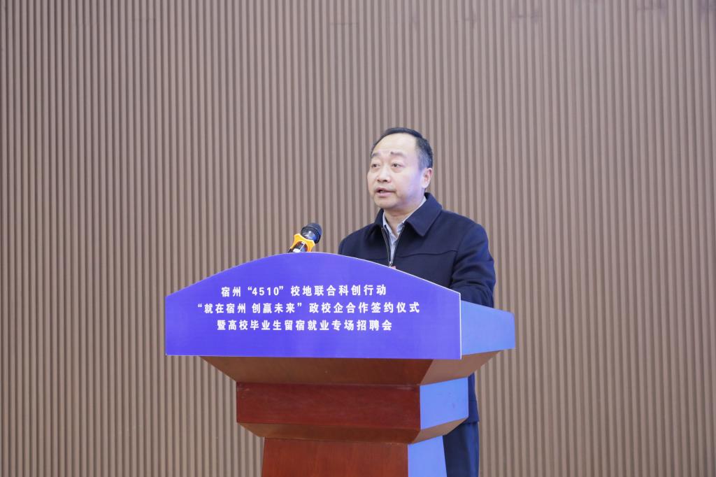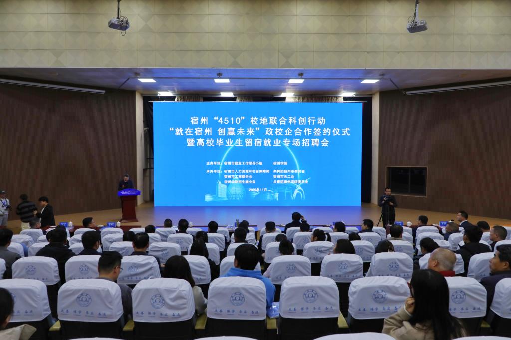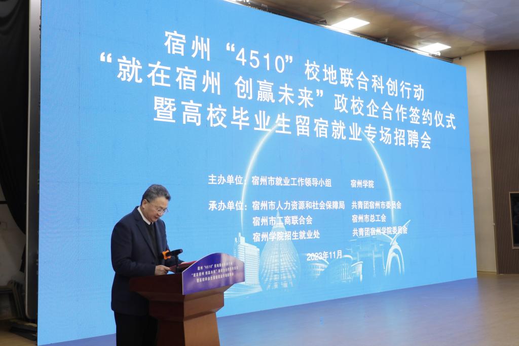 为贯彻落实党中央、国务院关于做好高校毕业生就业工作的决策部署,落实省委、省政府有关工作要求,拓宽高校毕业生就业渠道,11月20日下午,宿州“4510”校地联合科创行动“就在宿州 创赢未来”政校企合作签约仪式暨高校毕业生留宿就业专场招聘会在宿州学院教育园区校区举行。本次活动由宿州市就业工作领导小组、宿州学院联合主办,宿州市人力资源和社会保障局、共青团宿州市委员会、宿州市工商联合会、宿州市总工会、宿州学院招生就业处、共青团宿州学院委员会共同承办。宿州市人民政府副市长刘博夫,宿州学院党委书记李红,党委副书记、院长李福华,党委副书记王俊,党委委员、副院长杨维志等出席活动,签约仪式由李福华主持。