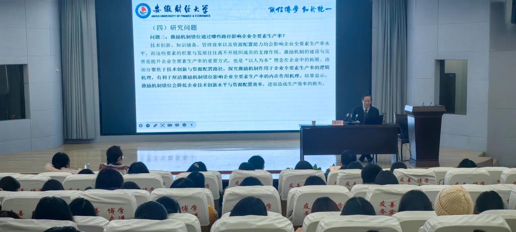 盛明泉教授报告会分两个阶段进行,第一个阶段在工科楼招聘大厅以“激励机制设计与企业全要素生产率”为题向与会师生进行了分享。介绍了近年来关于激励机制设计与企业全要素生产率研究的过程与成果,并就未来研究方向及重点关注的问题进行了分享。