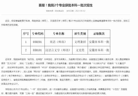 为服务新阶段现代化美好安徽建设,奋力实现“两个更大”的目标,2018年学校面向全国12个省份(直辖市、自治区)招生,2019年至2022年,学校面向全国13个省份(直辖市、自治区)招生,招生范围扩大,且生源充足。