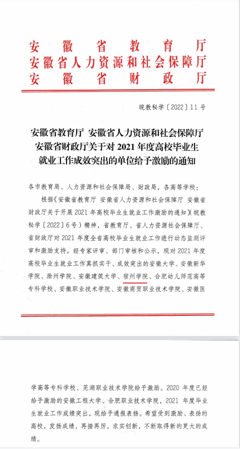 主动融入长三角一体化发展格局,就业工作不断提质增效。近五届毕业生就业地主要以安徽、江苏、上海、浙江等长三角地区为主,五年来,毕业生初次毕业去向落实率平均为88.8%,最终毕业去向落实率为94.4%;普通本科毕业生升学(含出国、出境研修)率为10.9%;毕业生创业率保持在1%以上,就业结构明显改善,就业质量稳中有升,人才培养服务地区经济发展情况良好,用人单位对毕业生的满意度平均达97.05%,对学校就业服务的满意度平均达96.99%。2022年3月24日,安徽省教育厅、安徽省人力资源和社会保障厅、安徽省财政厅联合发布了《关于对2021年度高校毕业生就业工作成效突出的单位给予激励的通知》,我院是受到激励表彰的5所本科高校之一。