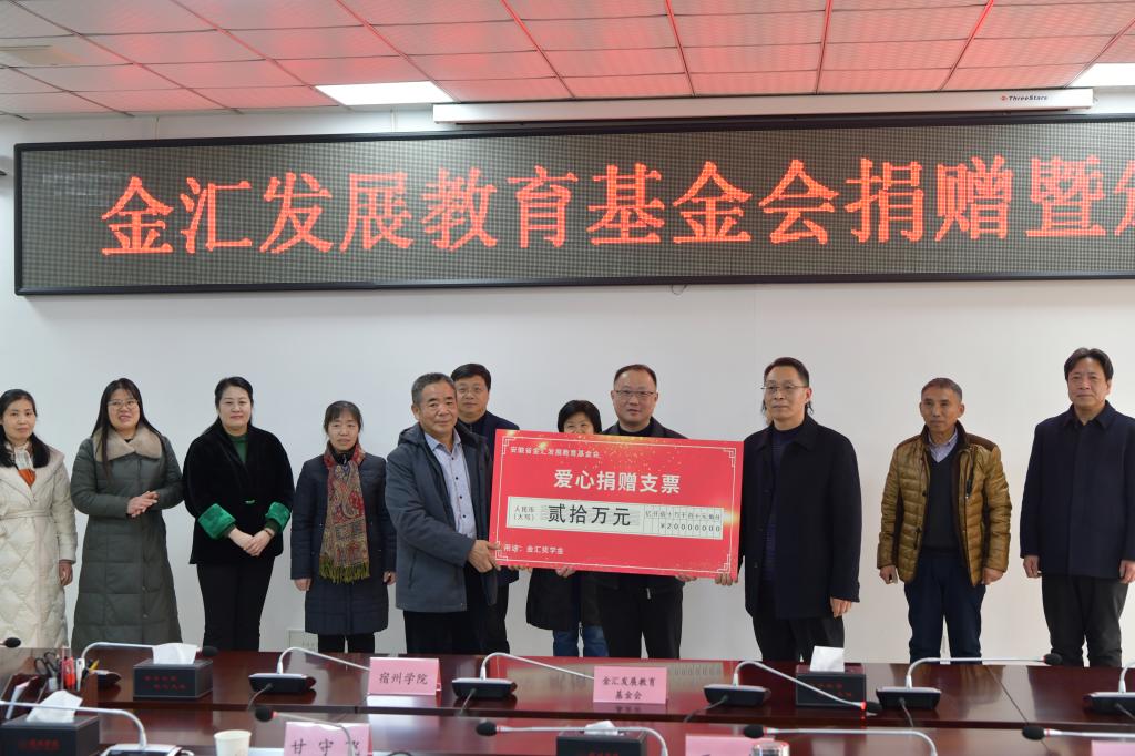 1月4日,安徽省金汇发展教育基金会捐赠暨“金汇奖学金”颁奖仪式在我院逸夫楼第一会议室举行。金汇发展教育基金会理事长王进、副理事黄世芳、秘书长王刚,中国人民银行宿州市分行党委书记、行长张超、宣传群工部副部长徐晓星,宿州学院党委副书记王俊出席仪式,学工部、招就处、化学化工学院负责同志,获奖学生代表参加活动。仪式由学工部部长甘守飞主持。