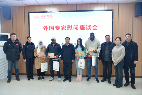 新春将至,岁寒情深。为加强和提升面向外国专家的服务质效,1月18日下午,我院在逸夫楼A504会议室召开外国专家慰问座谈会。院党委委员、副院长杨维志出席会议,人事处、国际交流与合作处负责人及相关工作人员参加会议。为增进外国专家对相关政策的了解,我院同时邀请了宿州市公安局出入境管理支队政委朱珠,市人民政府外事办公室外事科科长张博等业务主管部门一行6人参加慰问座谈。会议由国际交流与合作处处长安晓斌主持。