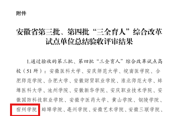 自2021年获批安徽省“三全育人”综合改革试点高校以来,我院坚持以习近平新时代中国特色社会主义思想为指导,全面统筹推进“三全育人”工作。强化组织领导,建立党委统一领导、部门分工分责、全员协同参与的责任体系。成立 “三全育人”综合改革试点工作领导小组,制定《宿州学院“三全育人”综合改革试点工作实施方案》,紧紧围绕立德树人根本任务,将思政工作贯穿、融入、结合到办学治校、教育教学各个环节,充分发挥课程、科研、实践、文化、网络、心理、管理、服务、资助、组织等方面的育人功能,形成了全员全过程全方位的一体化育人格局,高质高效完成各项目标任务,育人成效显著。