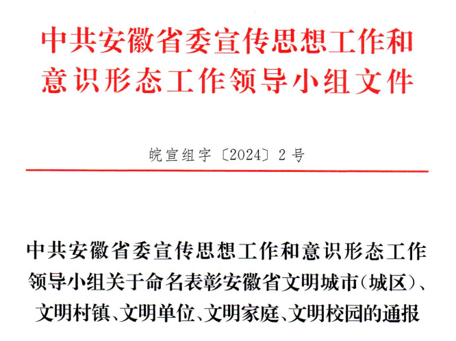 近日,从《中共安徽省委宣传思想工作和意识形态工作领导小组关于命名表彰安徽省文明城市(城区)、文明村镇、文明单位、文明家庭、文明校园的通报》文件获悉,我院顺利通过复查,蝉联“安徽省文明校园”荣誉称号,这是我院文明创建工作取得的又一显著成绩。
