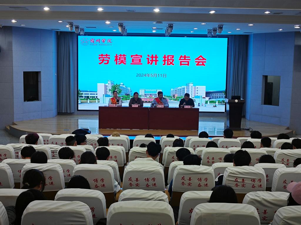 为全面贯彻落实中共中央、国务院《关于全面加强新时代大中小学劳动教育的意见》和教育部《大中小学劳动教育指导纲要(试行)》文件精神,充分发挥劳模精神在教育中的引领、示范作用,构建德智体美劳全面发展的人才培养体系,引导学生树立正确的劳动观念,养成良好的劳动习惯和品质,5月11日下午,宿州市总工会和宿州学院在学院招聘大厅联合开展了题为“劳动创造幸福生活”的劳模事迹宣讲报告会。宿州市公安局交警支队三大队副大队长、宿州市总工会兼职副主席赵猛和安徽省交通控股集团有限公司宿州管理中心宿州收费站收费员黄海艳进行了宣讲。宿州市劳动模范协会秘书长程秀娟出席报告会,各二级学院师生代表共计200余人参会,报告会由教务处处长陈松主持。