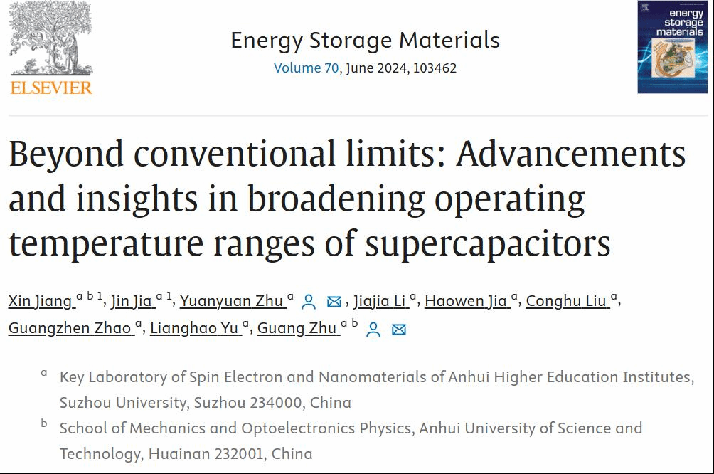 近日,我院自旋电子与纳米材料重点实验室、安徽省光电信息材料与新能源器件科研创新团队连续在新能源领域国际顶级期刊《Energy Storage Materials》《Applied Catalysis B: Environment and Energy》发表学术论文。联合培养硕士研究生蒋鑫为第一作者、青年教师贾进博士为共同第一作者,青年教师朱元元博士和朱光教授为通讯作者,以宿州学院为第一单位在Energy Storage Materials(中科院一区TOP期刊,影响因子20.4)发表题为“Beyond Conventional Limits: Advancements and Insights in Broadening Operating Temperature Ranges of Supercapacitors”的综述文章,深入探讨拓宽超级电容器工作温度界限的最新进展,重点聚焦于开拓性策略与材料。