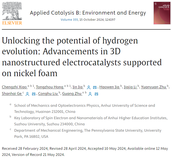 联合培养硕士研究生肖诚志以第一作者、洪铜洲以共同第一作者,朱光教授为通讯作者、宿州学院青年博士教师贾进、美国宾夕法尼亚州立大学Shanhai Ge教授为共同通讯作者在新能源领域国际顶级期刊《Applied Catalysis B: Environment and Energy》(中科院一区TOP期刊,影响因子22.1)发表题为《Unlocking the potential of hydrogen evolution: Advancements in 3D nanostructured electrocatalysts supported on nickel foam》的论文,探讨镍泡沫负载纳米结构电催化剂的研究进展及其展望。