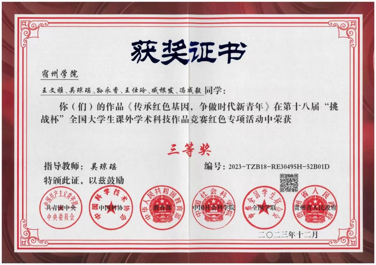 近日,第十八届“挑战杯”全国大学生课外学术科技作品竞赛授奖名单公布,我院教师吴琼瑶指导的作品《传承红色基因,争做时代新青年》在红色专项活动中获得全国三等奖。