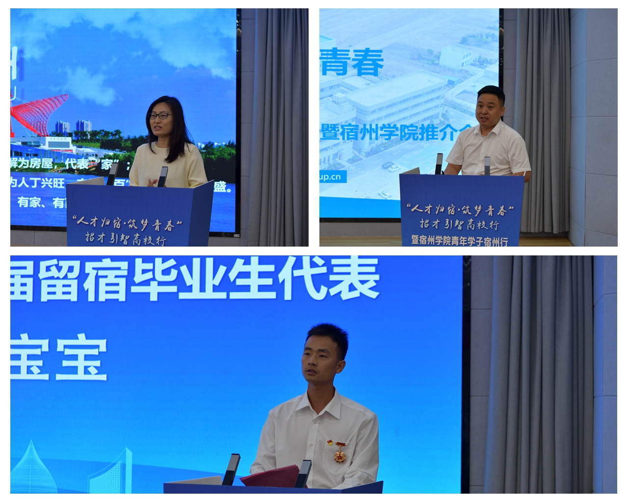 邵迪在致辞中表示,宿州是一座人杰地灵的文化圣地,是一座交通便捷的枢纽要地,是一座蕴藏丰富的资源宝地、是一座发展迅速的创新高地、是一座爱才惜才的和美福地。并从就业有补贴、创业有扶持、安家有保障三个方面介绍了宿州的就业创业政策,诚挚邀请诸位学子留在宿州,扎根宿州。
