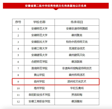 近日,安徽省教育厅公布了安徽省第二批中华优秀传统文化传承基地名单,我校“泗州戏文化艺术”传承项目成功入选。