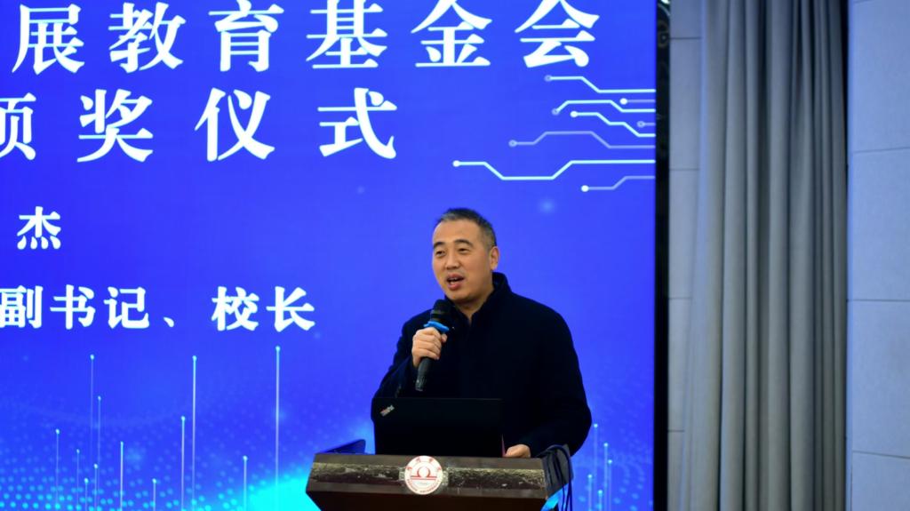 王进介绍了金汇发展教育基金会的基本情况及基金项目申请工作情况,他希望获奖同学,要常怀感恩之心,刻苦学习,将来回馈社会、报效国家,以实际行动回报学校的教育和社会的关爱。