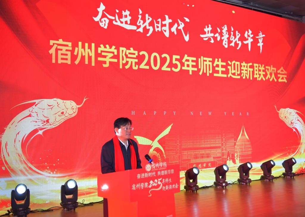 校党委书记李红发表了热情洋溢的新年致辞,向全体师生员工致以最诚挚的问候和新年的祝福。他指出,2024年是新中国成立75周年,也是学校建校75周年。一年来,学校坚持铸魂强基,唱响强党强国“最强音”;落实立德树人根本任务,唱响育人育才“主旋律”;坚持四个面向,唱响科技创新“进行曲”;强化开门办学,唱响产教融合“协奏曲”。2025年,学校将以迎接本科教育教学审核评估为契机,坚守为党育人、为国育才初心使命,全面落实立德树人根本任务,全面提升本科人才培养质量。希望大家坚持以习近平新时代中国特色社会主义思想为指导,继续发扬“友善、博学、务实、奋进”校训精神,坚定信心,团结奋进,扎实工作,不忘初心,砥砺前行,共同开创宿州学院更加美好的明天!