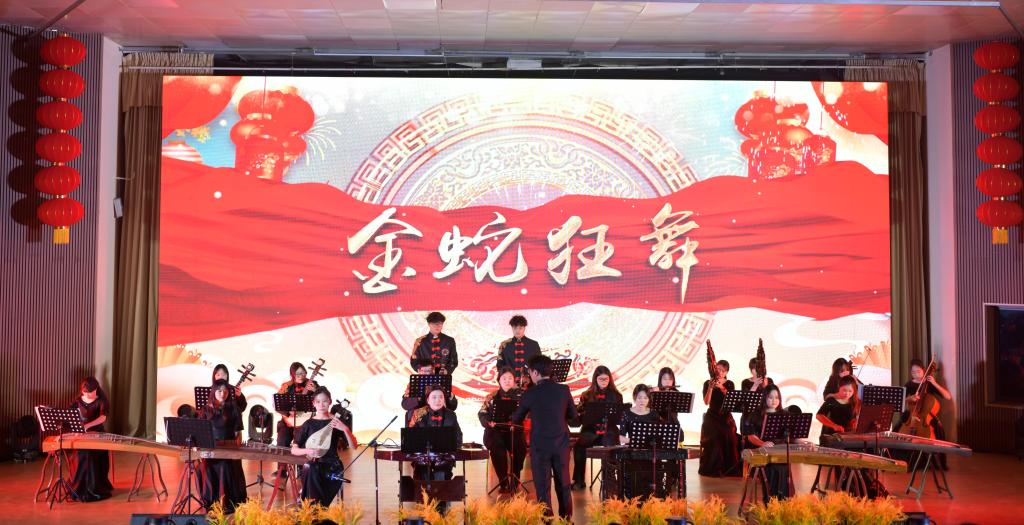 本次联欢会以“奋进新时代、共谱新华章”为主题,分为“春华秋实,行而不辍”“砥砺奋进,扬帆起航”“同舟共济,逐梦未来”“风鹏正举,再续华章”四个篇章。联欢会在舞狮表演《舞狮报喜贺新春》和民族管弦乐合奏《金蛇狂舞》《渔歌》中拉开序幕。《月光下的中国》《盛世中国的诗意》《少年中国说》《茶香满庭芳》《光影霓裳韵》《明天会更好》......精彩节目依次上演,歌曲、舞蹈、相声、朗诵、戏曲、走秀、茶艺表演,内容丰富,形式多样,精彩纷呈,表达了宿州学院师生对伟大祖国的美好祝福,对未来发展的坚定信心,充分展示了师生精彩才艺与精神风采。现场荧光棒如波起伏,掌声阵阵,师生们心心相连,共同享受着这场视听盛宴,整场联欢会热情洋溢、欢快温馨。