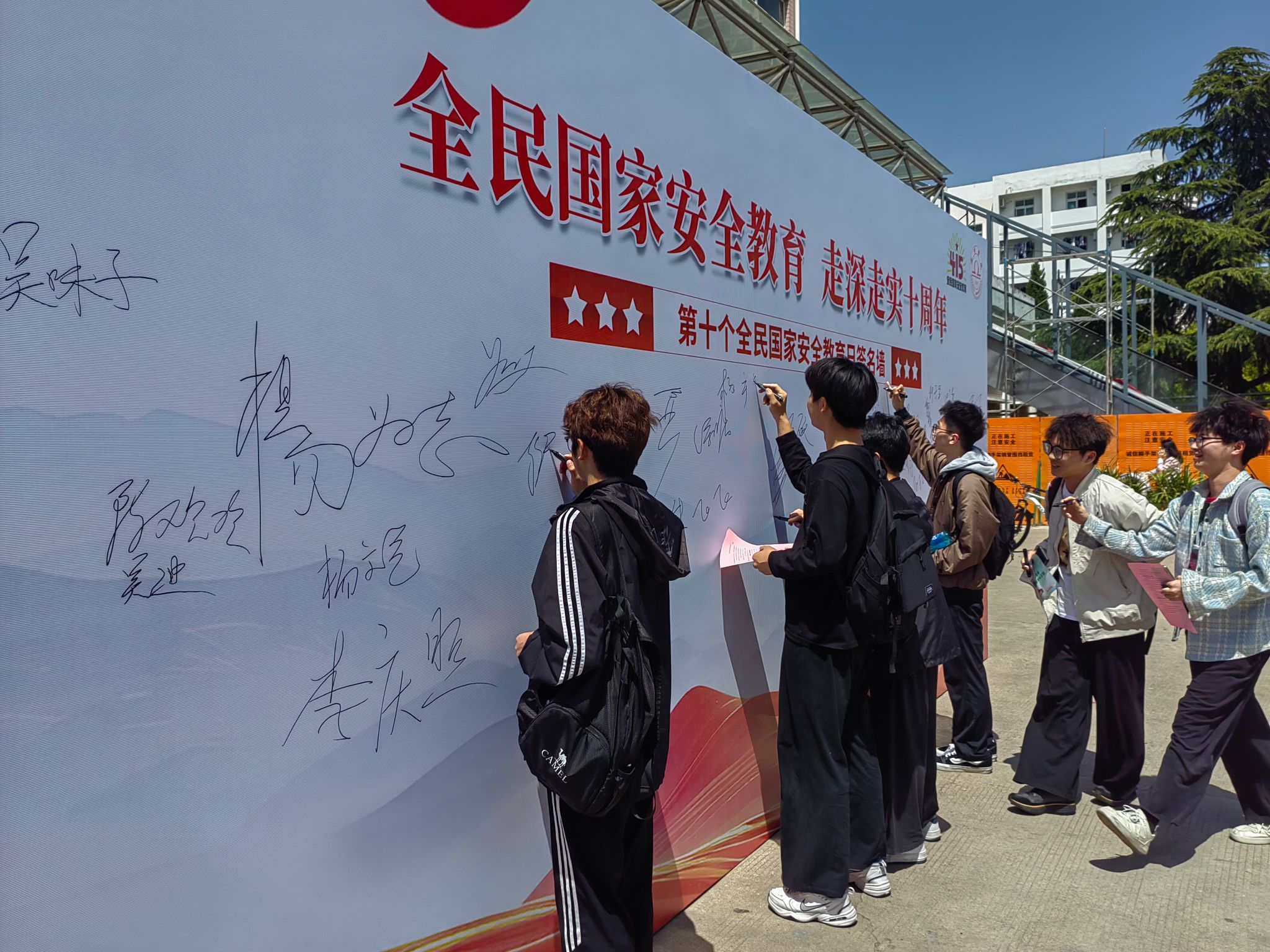 中午11时30分,在一食堂门前举办了主题签名活动。校领导、部分职能部门主要负责人及各学院师生代表在 “全民国家安全教育走深走实十周年” 签名墙上签名,现场工作人员还向师生发放了普法宣传单。