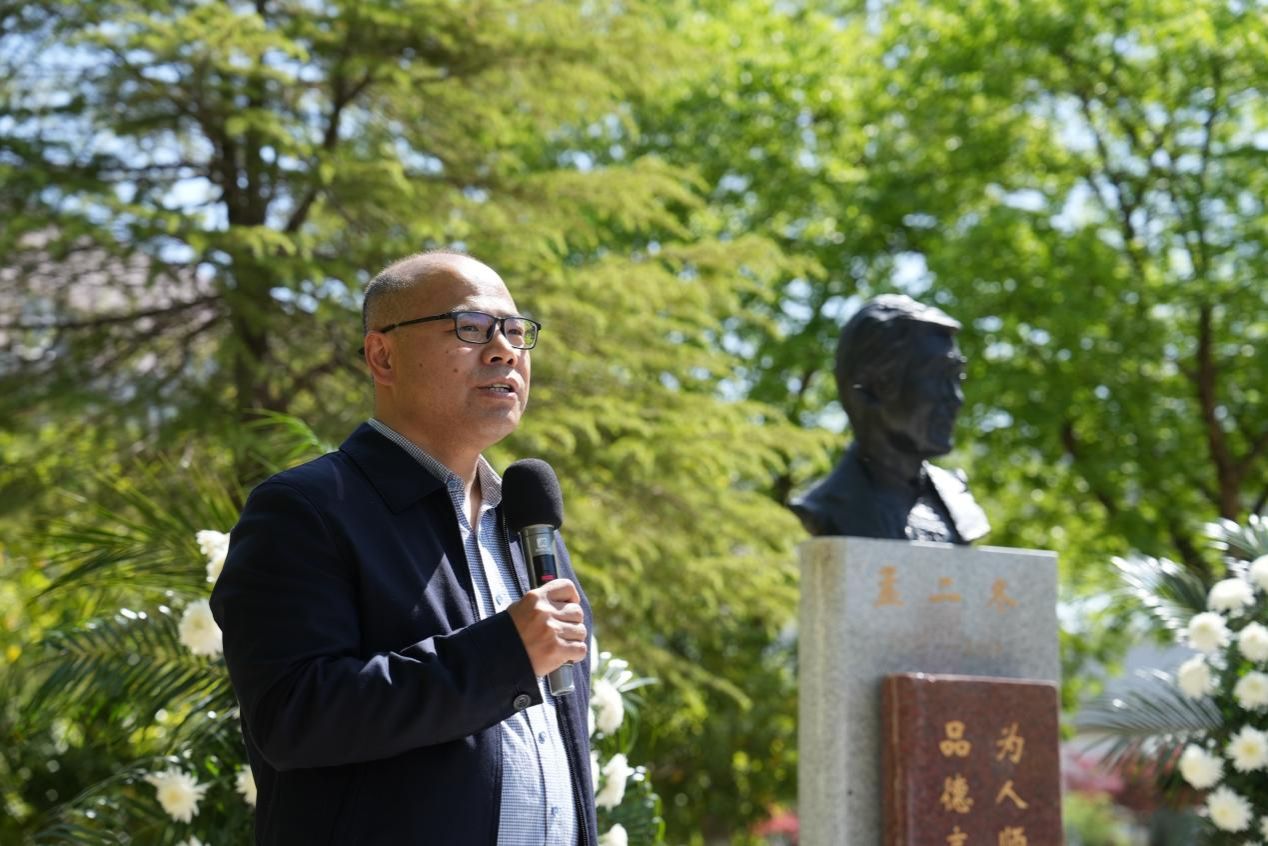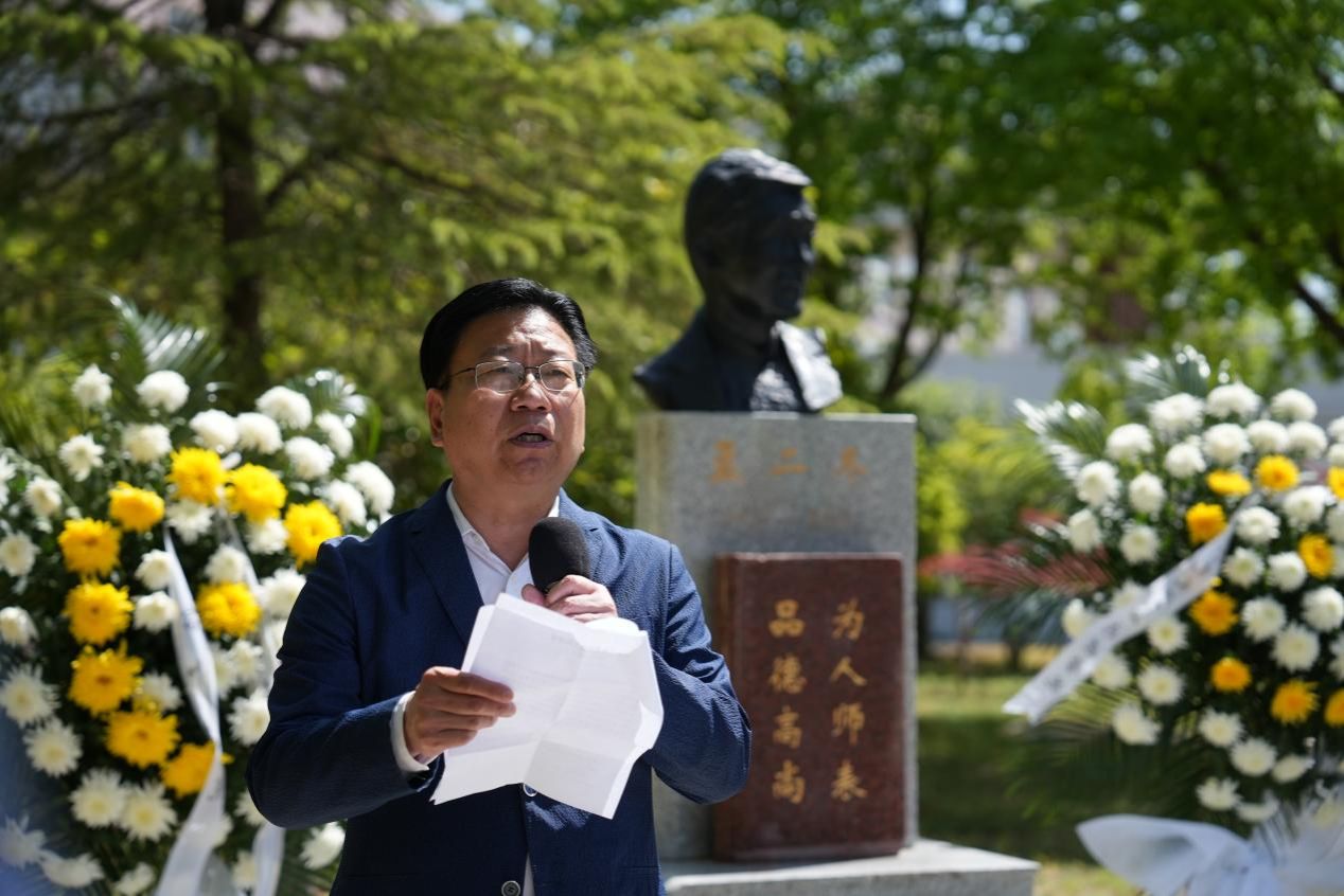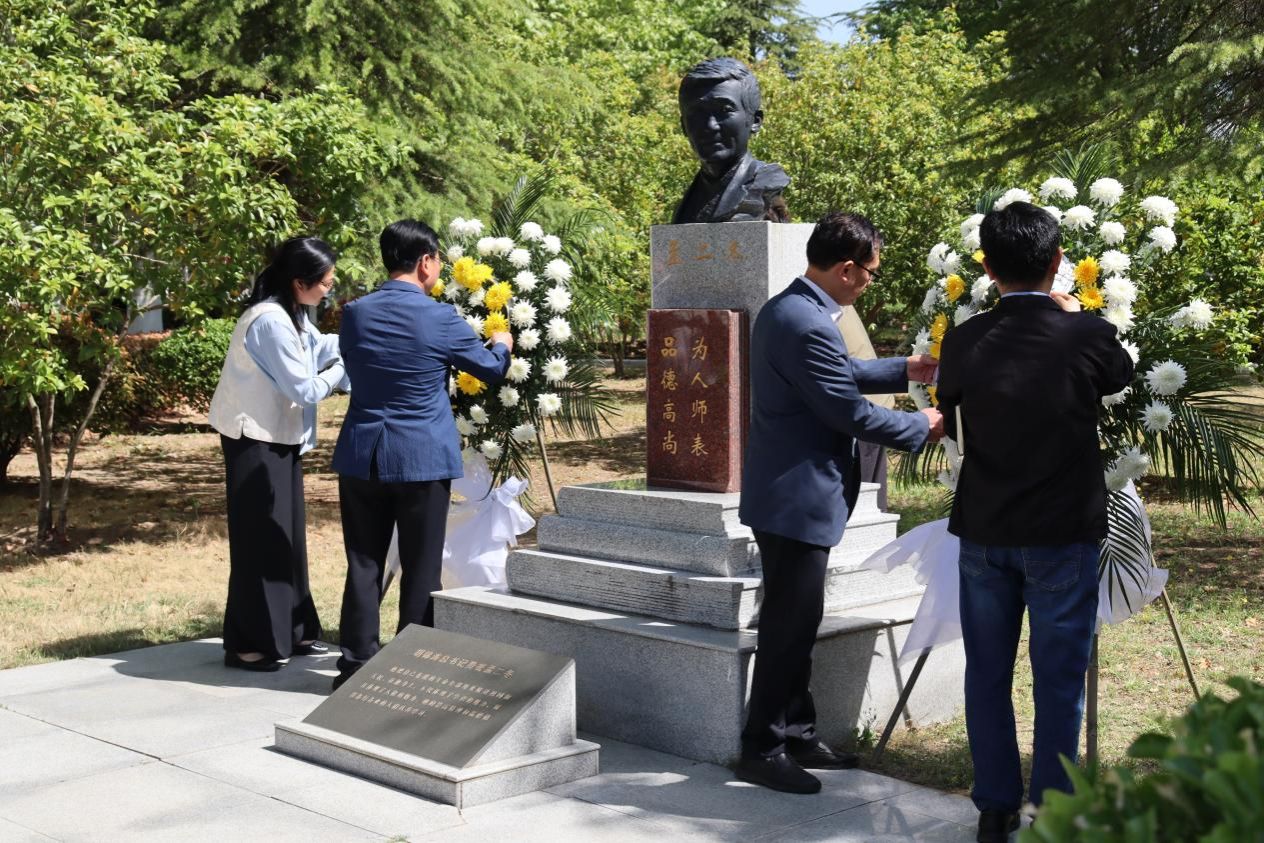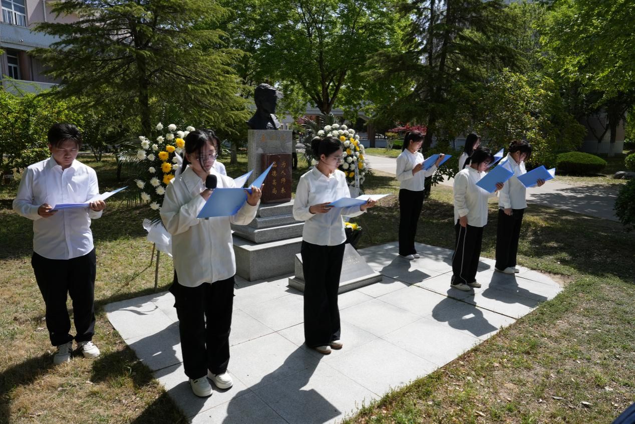 学生代表向孟二冬雕像敬献花篮,杨维志、岳尧、肖良、李月云共同扶正挽联。刘占召教授向孟二冬雕像敬献鲜花。全体人员默哀三分钟致敬,以示深切缅怀之情。