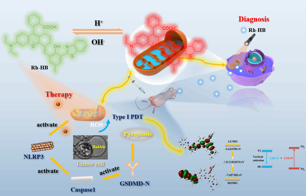 2025年5月,该研究团队在生物化学SCI期刊Biosensors and Bioelectronics(中科院1区Top期刊,IF=10.7),发表题为《A Mito-targeted, pH-sensitive type I photosensitizer for the diagnosis and therapy in bone metastasis of triple negative breast cancer by activating pyroptosis pathway》研究论文,宿州学院为论文第一完成单位,叶亚熙博士为第一作者,我校张兴桃教授、南京大学朱海亮教授、安徽医科大学刘新华教授为通讯作者。研究首次报道了Rh-HB,一种智能近红外(NIR)小分子荧光探针,用于三阴性乳腺癌(TNBC)骨转移的线粒体靶向治疗。作为一种比率测量、双激发pH敏感的荧光探针,Rh-HB能够实时监测与早期转移进展相关的线粒体pH波动,为诊疗TNBC的骨转移提供了一种有前景的策略。