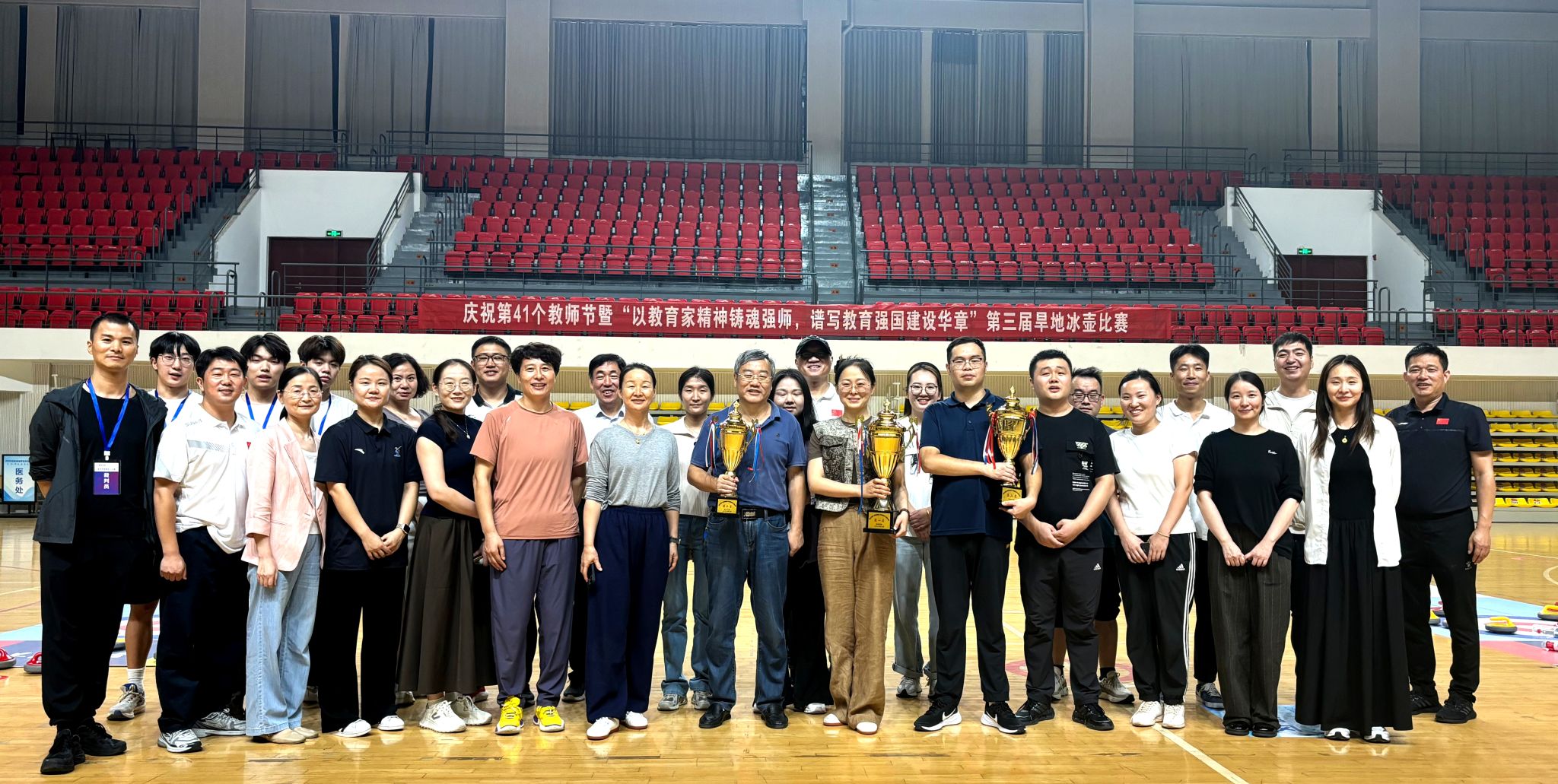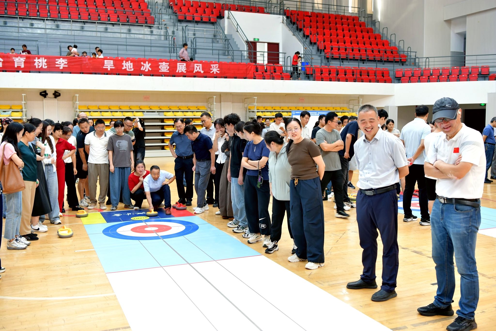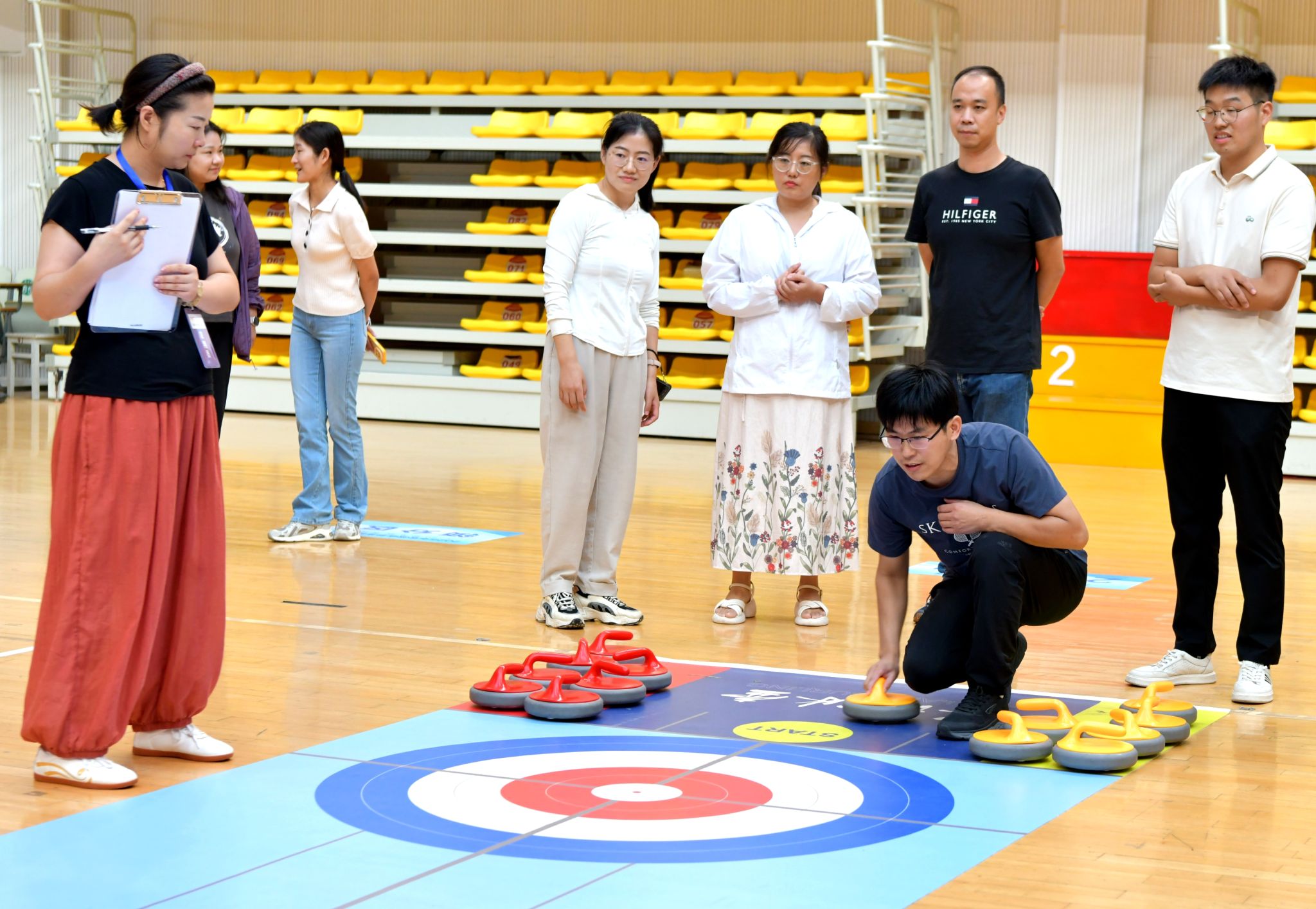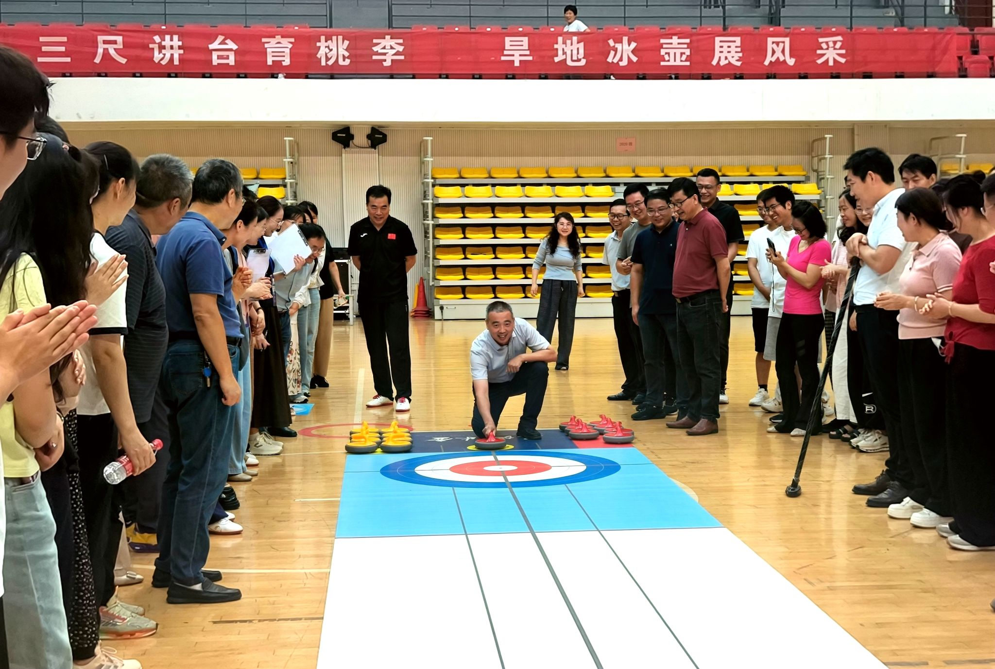 为庆祝第41个教师节,9月9日,由校党委教师工作部、工会、体育运动委员会主办,体育学院承办的宿州学院“以教育家精神铸魂强师,谱写教育强国建设华章”第三届旱地冰壶比赛在教育园区体育馆内举行。比赛吸引了各二级学院、各职能部门组成的46支队伍参加。