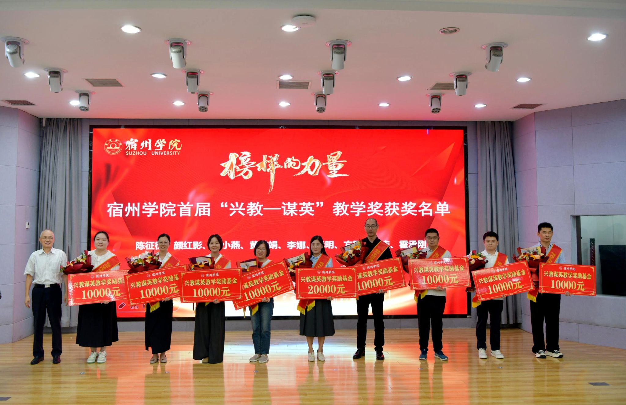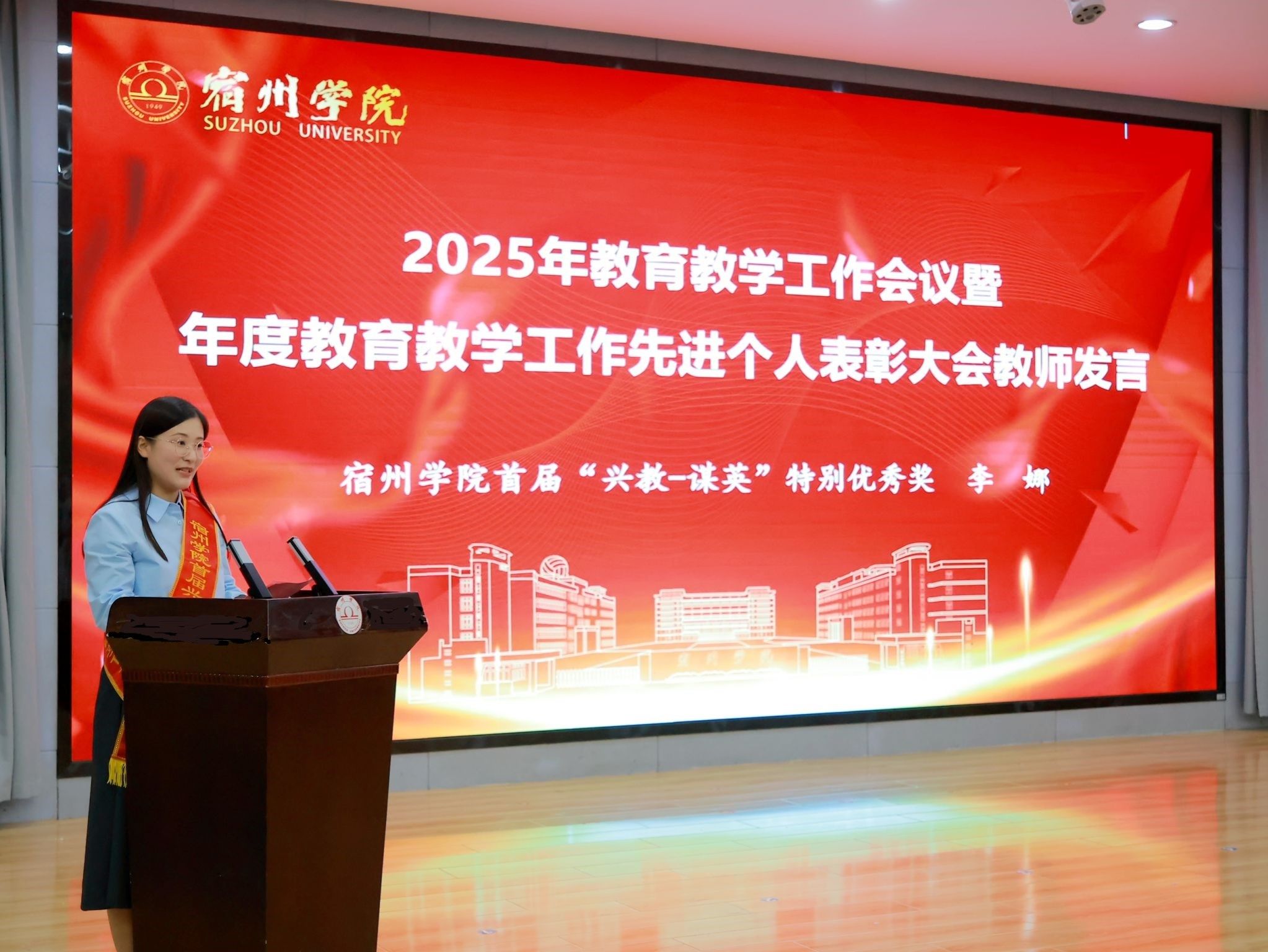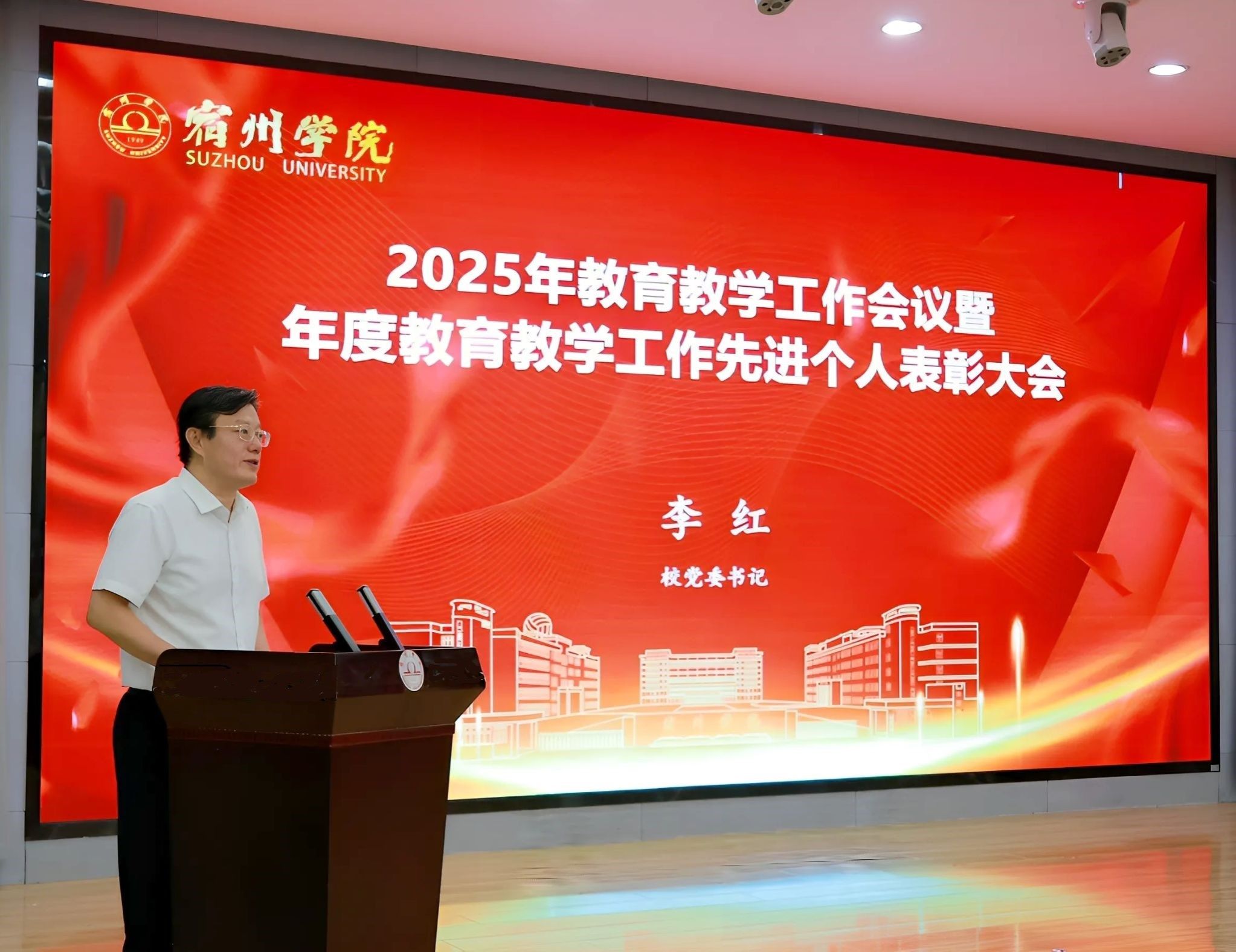 李红代表学校向奋战在一线的全体教职工致以节日问候和崇高敬意,向受到表彰的先进个人表示祝贺,向张训苏校友慷慨捐资设立“兴教—谋英”教学奖,并为首届获奖教师颁奖表示感谢。他指出,学校召开本次会议,就是要大力弘扬教育家精神,落实立德树人根本任务,夯实人才培养中心地位,树牢大抓教育教学这个鲜明导向,为加快建成特色鲜明的地方应用型高水平大学蓄创新之势、赋育人之能。要胸怀“国之大者”,践行初心使命,以高度的政治自觉扛起责任担当;要聚焦重点任务,深化改革创新,以“抓铁有痕”的作风推动工作落实;要强化保障措施,加强统筹协调,以时不我待的紧迫感凝聚强大合力。他强调,我们要以胸怀“国之大者”的格局、把握时代使命的清醒、扛起政治担当的坚定,踔厉奋发、勇毅前行,不断开创学校教育教学工作新局面,为早日建成特色鲜明的地方应用型高水平大学而努力奋斗。