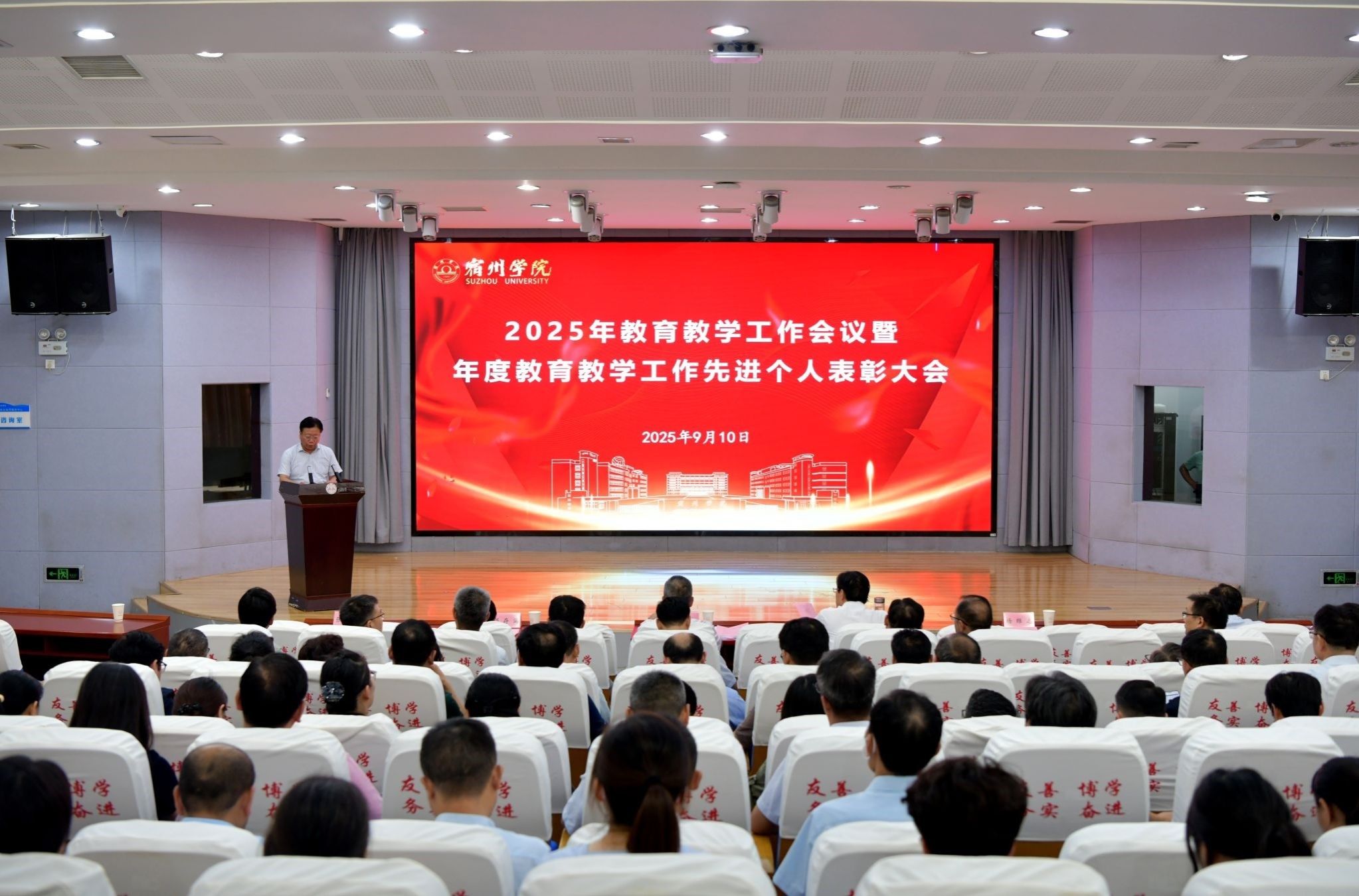 9月10日下午,我校2025年教育教学工作会议暨年度教育教学工作先进个人表彰大会在就业服务中心举行。校党委书记李红,党委副书记、校长闵杰,党委常委、纪委书记、监察专员邢存海,副校长陈得宝,优秀校友、上海景领投资管理有限公司董事长张训苏先生出席活动。全校副处级以上干部,各二级学院教学秘书、实验室主任、教研室主任、过去一年教育教学工作领域先进个人等200余人参加活动。党委常委、副校长杨维志主持会议。
