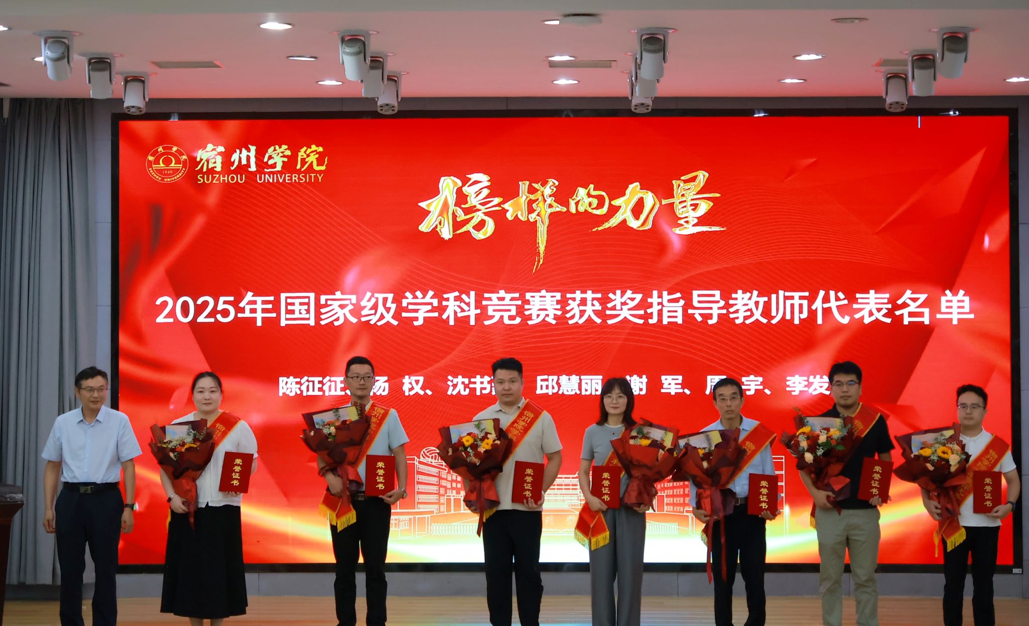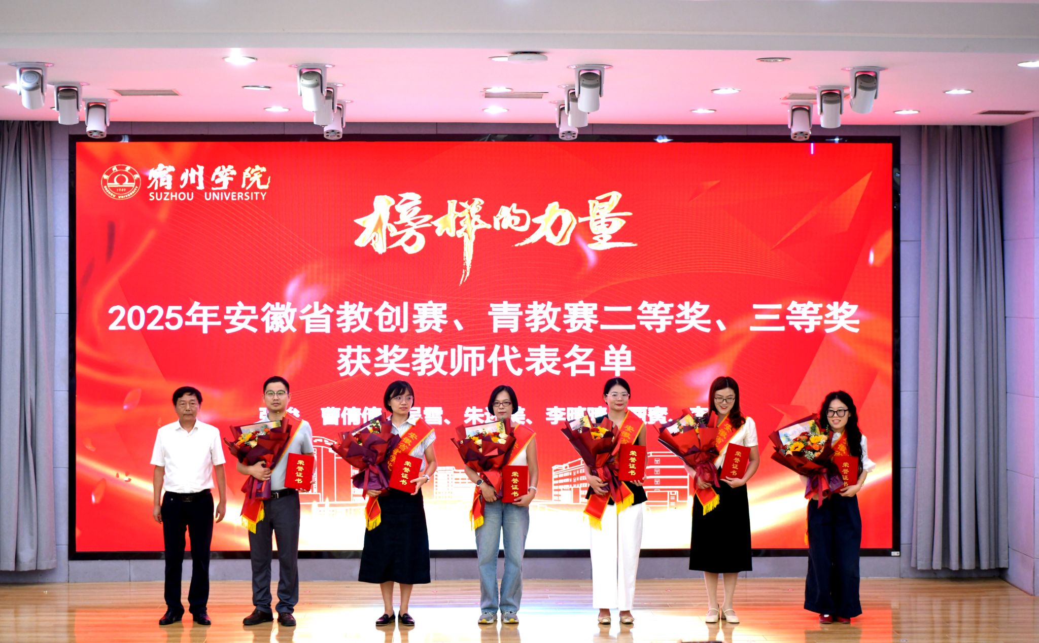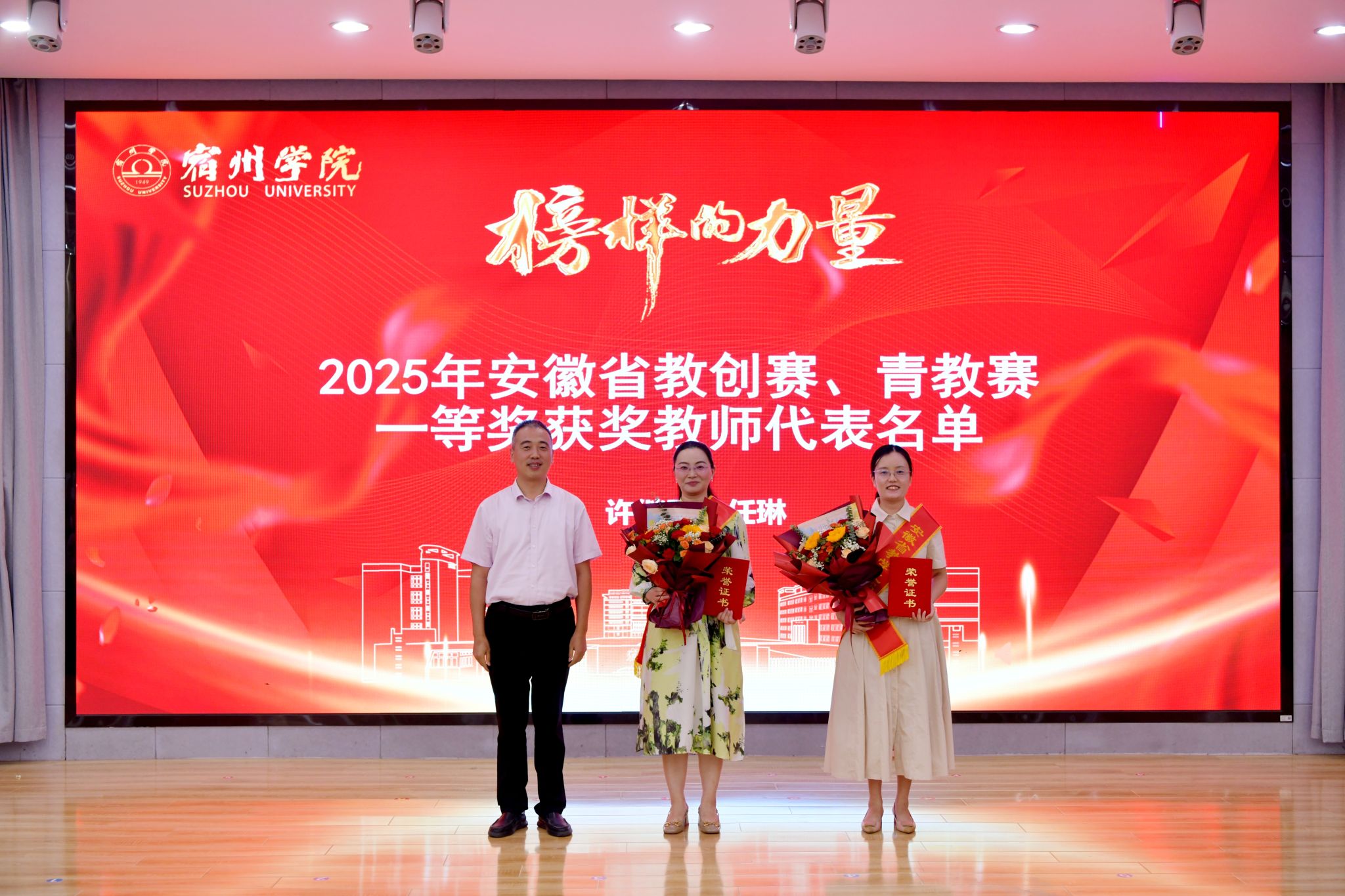 校领导和张训苏分别为学科竞赛优秀指导教师,安徽省教创赛、青教赛、宿州学院首届“兴教-谋英”获奖教师,国家一流课程教师团队颁发荣誉证书。