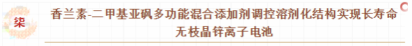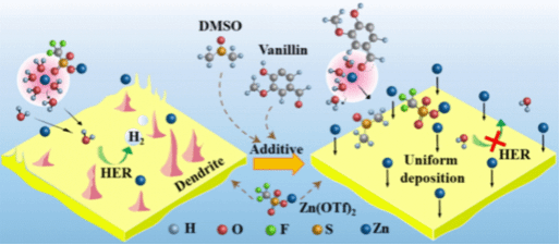 随着可再生能源的快速发展,开发低成本、高安全性的储能技术成为全球关注焦点。水系锌离子电池因具备高理论比容量(819 mAh g−1)、环境友好、成本低廉等优势,被视为大规模储能系统的理想候选。然而,锌负极在循环过程中易产生枝晶,发生析氢反应(HER),导致电池性能衰减,严重制约其实际应用。该研究使用香草醛与二甲基亚砜(DMSO)为复合电解质添加剂,加入三氟甲烷磺酸锌(Zn(OTf)2)当中。香草醛的加入提高了Zn(OTf)2的溶解度,导致锌离子扩散速率增加,电池电阻降低,电化学窗口扩大(为纯Zn(OTf)2电解液的三倍左右)。DMSO的加入改变了Zn2+的溶剂化鞘,减少了初级溶剂化鞘中的水分子数量,增加了OTf−分子的数量,从而抑制了HER,使得Zn||Zn电池在1.0 mA cm−2/1.0 mA h cm−2下的循环寿命超过4000小时。研究团队进一步将混合添加剂应用于Zn||CNVO全电池,在1.0 A g−1电流密度下循环900次后仍保持100 mAh g−1以上的比容量,展现出优异的应用前景。