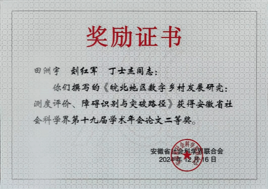 2024年12月,在安徽省社科界第十九届(2024)学术年会上,我院商学院田洲宇老师的《皖北地区数字乡村发展研究:测度评价、障碍识别与突破路径》研究论文,荣获年会论文二等奖。