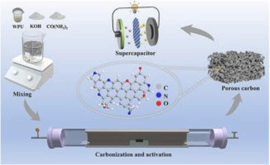 超级电容器作为高功率密度、长循环寿命的先进储能器件,在电动汽车、智能电网等领域具有不可替代的作用,而电极材料的性能是决定其储能效率的核心。当前主流的生物质基碳材料存在原料品质不均、前驱体与活化剂/掺杂剂混合不均、需复杂纯化工艺等问题,严重制约其性能稳定性与规模化应用。针对上述瓶颈,提出一种绿色简化策略:以工业级水性聚氨酯(WPU)为唯一碳前驱体,通过KOH活化与尿素掺杂的协同作用,经“水溶液分散-干燥-氮气氛围碳化”工艺,成功制备出N/O共掺杂的分级多孔碳材料。该方法无需石墨烯oxide(GO)或金属催化剂,实现了分子级均匀掺杂与多孔结构精准调控,所获最优材料(WPU-800)具有丰富的微孔-介孔分级结构、超高比表面积(1717.15 m²/g)与合理孔容(0.87cm³/g),且N、O元素掺杂量分别达2.12 at.%、11.91 at.%,可高效提升电极的导电性与赝电容贡献。