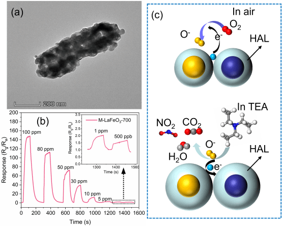 该科研团队在这项研究中,以金属有机骨架(MOF)为前驱体,采用直接液相合成法和热处理法制备了中空介孔LaFeO₃/La₂O₃复合材料。这种MOF衍生的策略可以精确地调整LaFeO₃的微观结构和物理化学性质,同时促进La₂O₃装饰异质结的形成。所得到的复合材料被用于制造三乙胺(TEA)气体传感器。该传感器在240℃的温度下对100 ppm TEA表现出大约150的显著响应,这大约是原来的LaFeO₃的10倍。这种优异的性能归因于通过中空介孔结构增强的气体扩散和LaFeO₃和La₂O₃之间的异质结诱导的有效电荷分离。此外,该传感器具有检出限低、重复性好、长期工作稳定性好、选择性高、响应/恢复时间快(31 s/41 s)等特点。这些发现突出了MOF衍生的LaFeO₃/La₂O₃异质结构作为选择性TEA检测的高效传感材料的潜力。