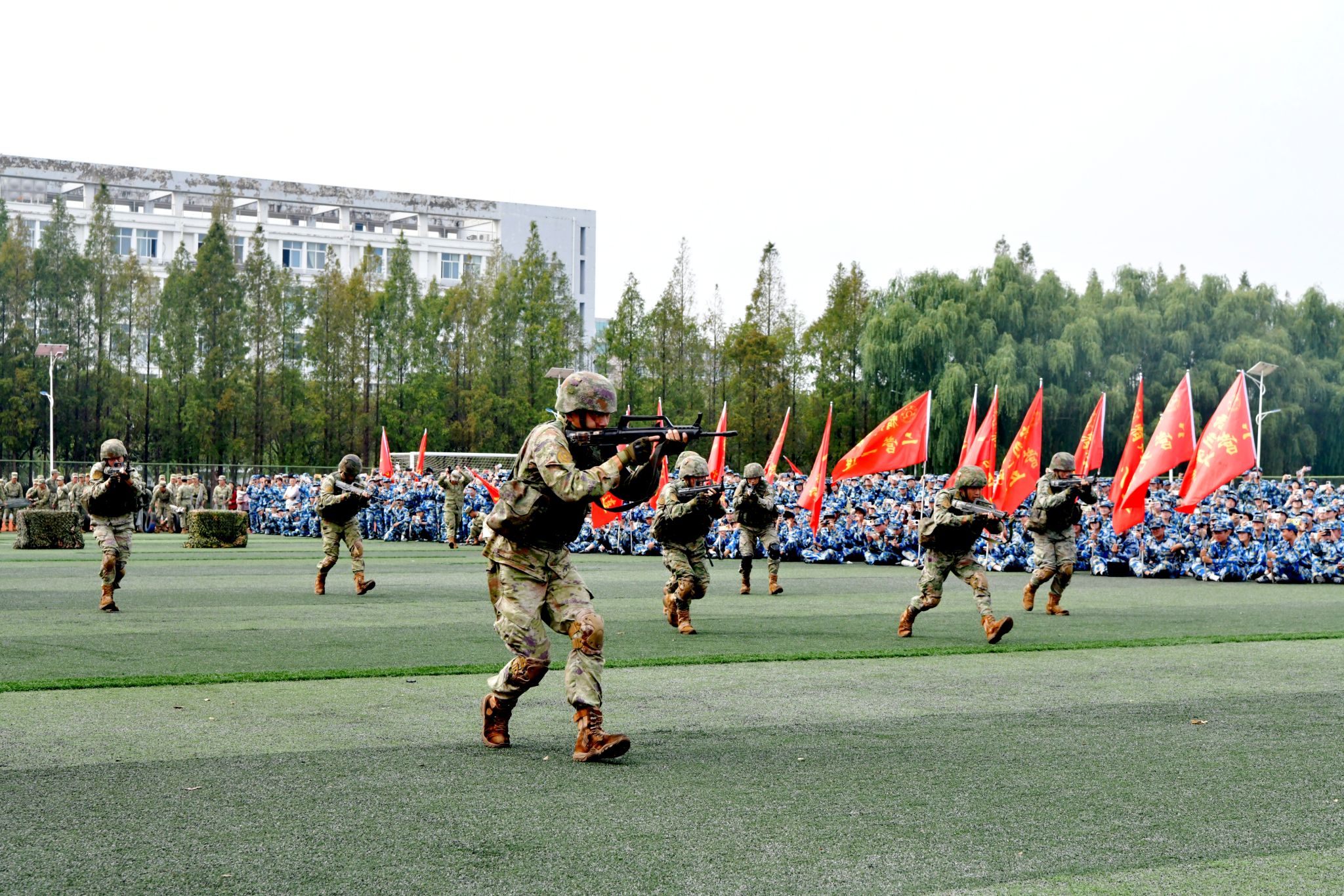 军训汇报环节,各方阵同学依次迈着铿锵有力的步伐接受检阅。带训教官进行了精彩战术表演,赢得阵阵掌声。