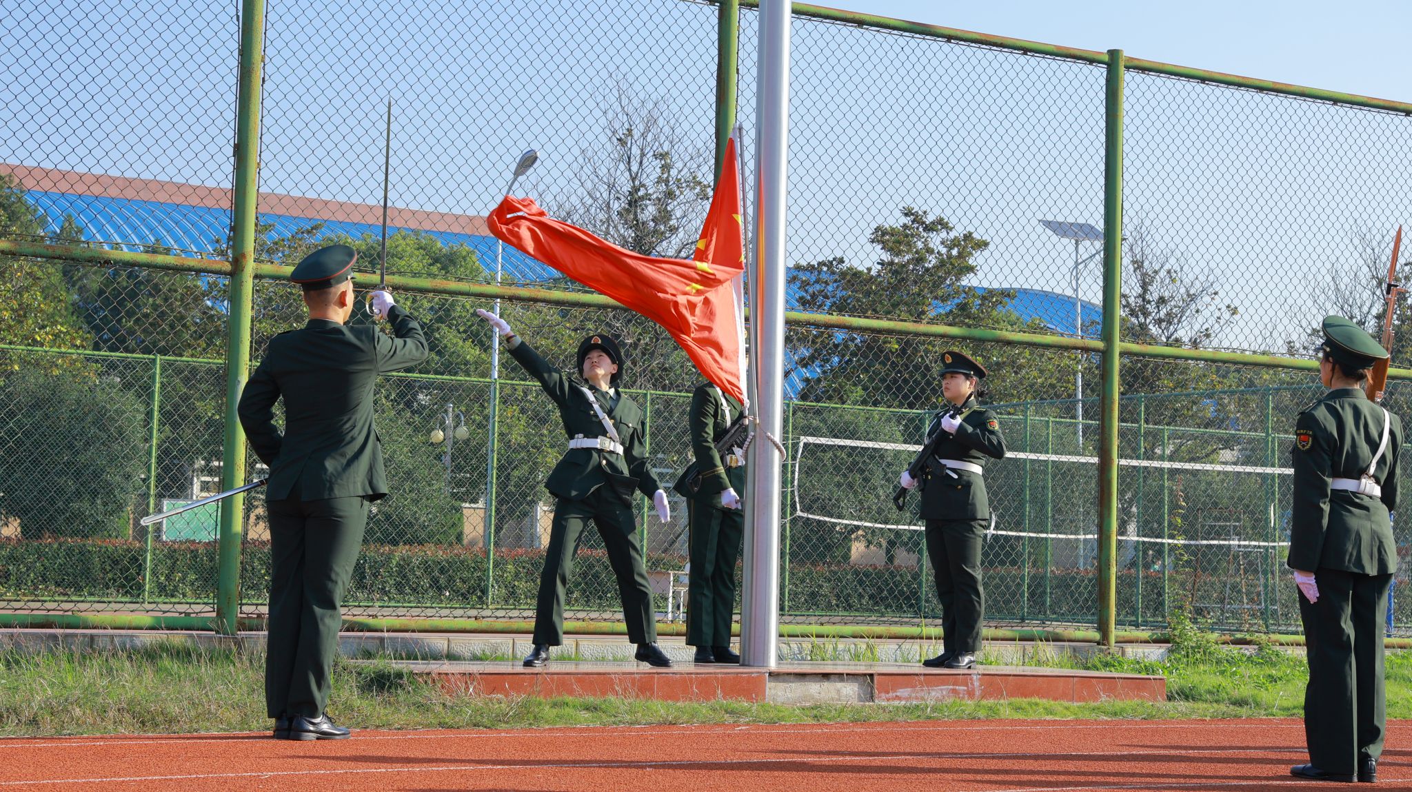 伴随着慷慨激昂的运动员进行曲,国旗护卫队高举鲜艳的五星红旗,以整齐划一的步伐率先进场,各二级学院方阵精神饱满、口号嘹亮依次经过主席台。入场完毕,全体师生肃立,奏唱国歌,举行了升旗仪式。