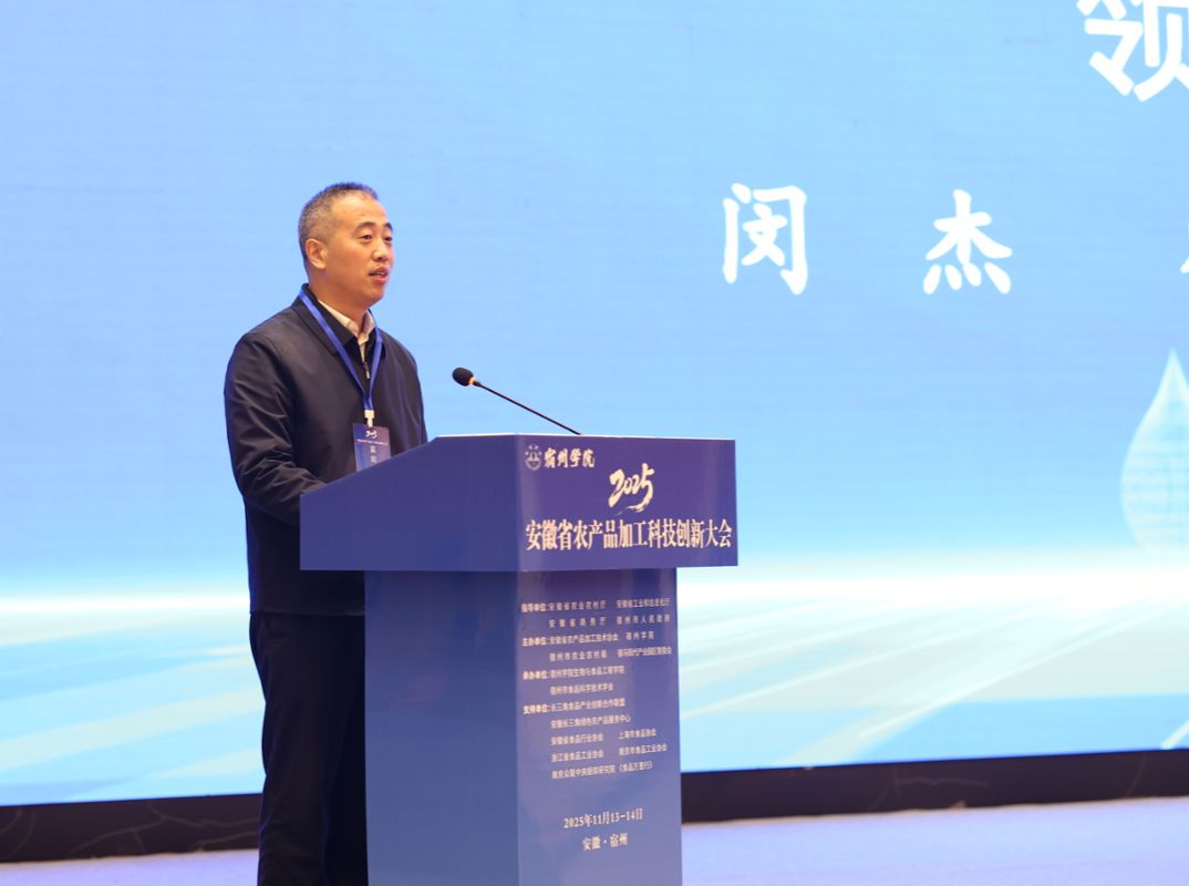 闵杰在致辞中简要介绍了宿州学院坚持扎根地方、开放办学,深入实施“4510”校地联合科创行动,在学科专业建设、高层次人才引育、科技创新与成果转化等的主要成效。他指出,农产品加工是推动农业产业化、实现乡村振兴的核心引擎,科技创新是破解农产品“卖难”“价低”“链短”问题的根本路径。希望大会围绕农产品深加工、农业科技创新、物流体系建设、价值链提升等核心议题深入研讨,催生更多农产品产业方面的产学研融合创新成果。他表示,宿州学院将以此次大会为契机,优化学科专业布局,强化农产品加工领域人才培养与科研创新,深化产学研用协同合作,为安徽农产品加工产业高质量发展注入新动能。