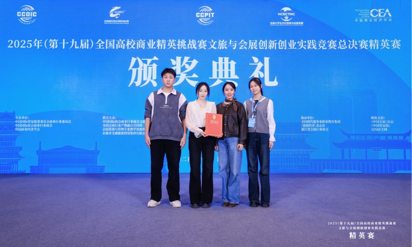 近日,2025年(第十九届)全国高校商业精英挑战赛文旅与会展创新创业实践竞赛全国总决赛精英赛在浙江省永康市落幕。我校文学与传媒学院2023级文化产业管理专业方亮升团队荣获全国一等奖1项,同专业王乐勇团队、欧阳梦婷团队及汪晨团队获得全国三等奖3项,2026年国际文旅与会展大赛入围奖1项,创下我校在该项赛事中的历史最佳成绩。
