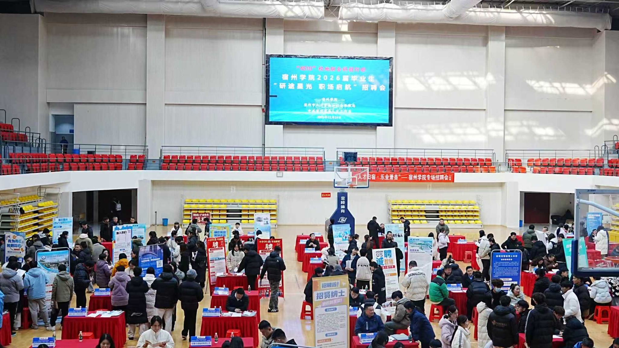 12月24日下午,我校与宿州市人力资源和社会保障局、中共宿州市委人才工作局联合举办“4510”联合科创行动——宿州学院“研途星光 职场启航”2026届毕业生研后专场招聘会。校党委副书记、校长闵杰,各学院领导班子成员及辅导员参加活动。