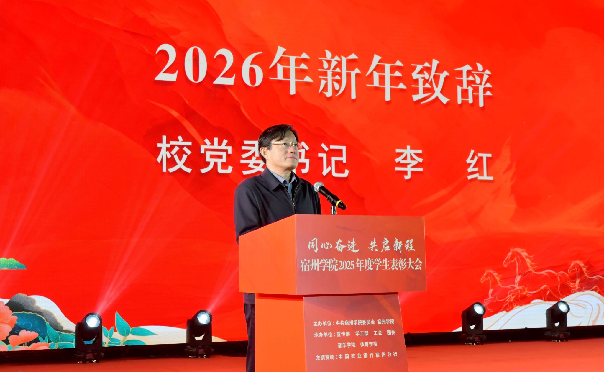 校党委书记李红致辞,向受到表彰同学致以热烈祝贺。他回顾了2025年学校发展取得的主要成绩,特别是广大学子奋勇拼搏、超越自我、同心筑梦、为校争光,取得的一系列骄人成绩。展望2026年,他寄语全体教职工要牢记为党育人、为国育才的初心使命,树立“躬耕教坛、强国有我”的志向和抱负,大力弘扬教育家精神,把立德树人融入办学治校、教书育人全过程,科学回答好“培养什么人、怎样培养人、为谁培养人”这一核心课题。他寄语广大同学要牢记习近平总书记殷殷嘱托,坚定不移感党恩、听党话、跟党走,胸怀家国、修养品行、拼搏奋进,争做有理想、敢担当、能吃苦、肯奋斗的新时代好青年。