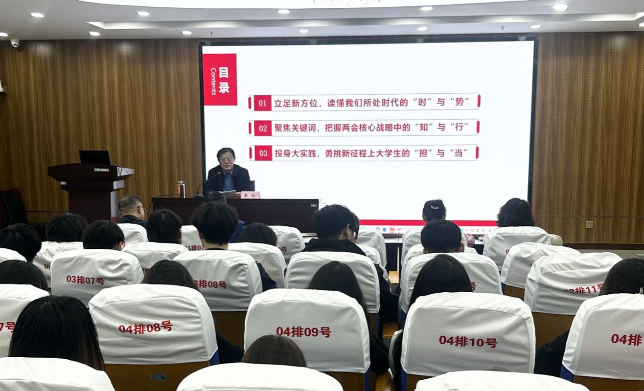 宣讲以“学习贯彻全国两会精神,书写强国有我青春华章”为题,紧密结合我国发展面临的形势、挑战与取得的重大成就,深入阐释和系统解读了全国两会精神。指出,2026年全国两会是在“十四五”圆满收官、“十五五”开局起步的关键节点召开的一次重要会议。会议审议通过的“十五五”规划纲要和政府工作报告,通篇贯穿习近平新时代中国特色社会主义思想,牢牢把握高质量发展主题,充分彰显深远战略谋划、锐意改革创新与真挚为民情怀。勉励同学们要把两会精神内化于心、外化于行,坚定理想信念,主动融入国家发展大局;练就过硬本领,积极对冲“本领恐慌”;涵养健全人格,做有德有识的时代新人,在奋力推进中国式现代化、实现民族复兴伟业的新征程上,书写无愧于时代、无愧于青春的精彩华章。