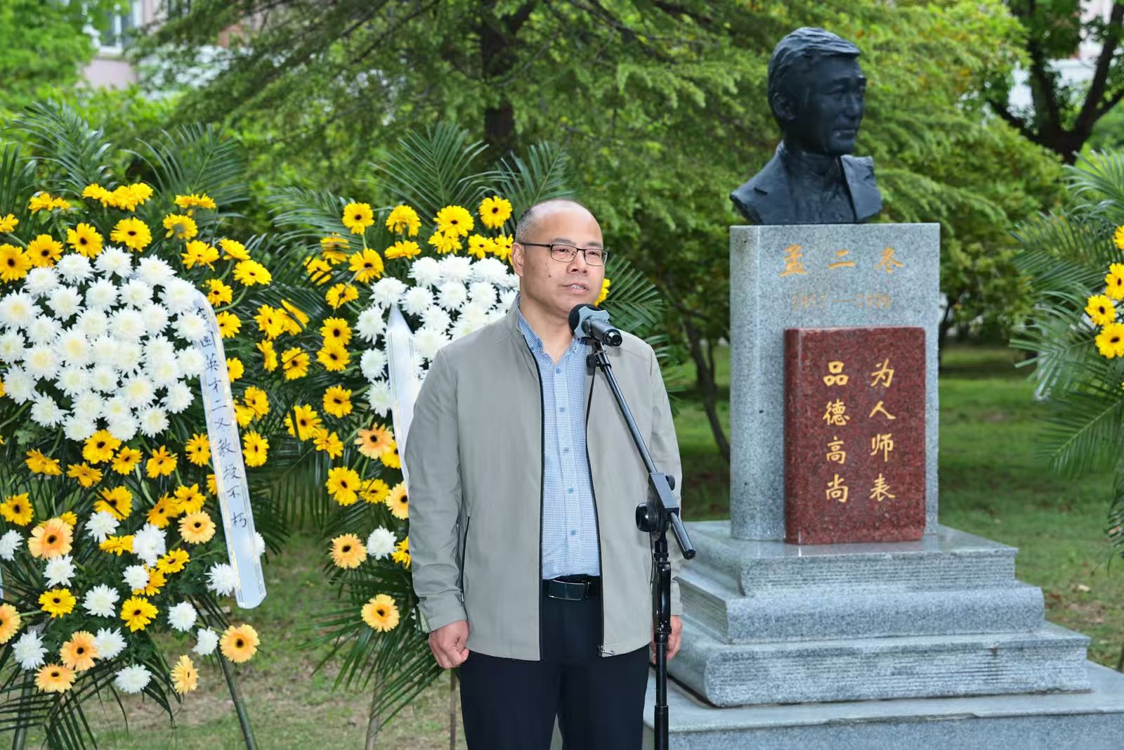 耿琴老师,宿州学院党委书记李红,石河子大学党委常委、宣传部部长金亚丽,烟台大学党委常委、宣传部(教师工作部)部长杨众晖,北京大学中国语言文学系教务办主任江禾,原宿州师专中文系主任周治杰,向孟二冬先生雕像敬献花篮并扶正挽联。全体人员垂首默哀,以示深切缅怀之情。