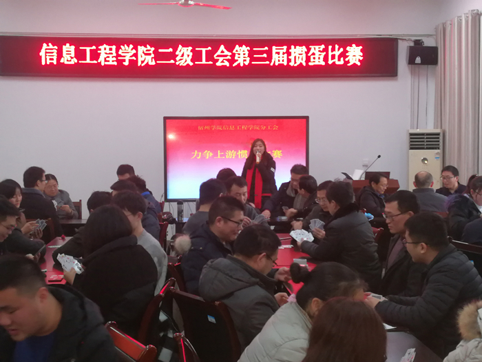 为了迎接春节的到来,丰富信息工程学院全体教职工业余生活,调动大家参加集体活动的积极性,增加教职工之间交流学习、团结互助的精神,增进彼此间的友谊和感情,信息工程学院于2020年1月7日下午2:30在工B315举办第三届教职工掼蛋比赛。信息工程学院全体教职工,兄弟学院、各个行政部门教职工参加此次活动。校工会主席王勇到现场为此次比赛做技术规则指导。