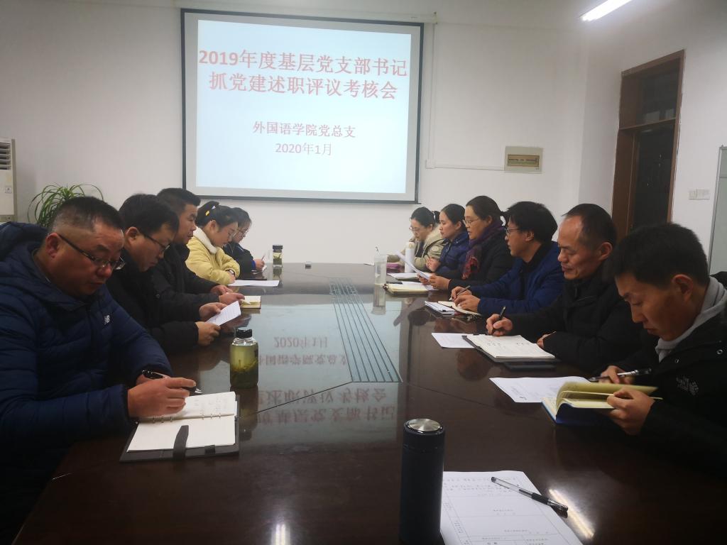 1月9日下午,外国语学院党总支在院318会议室召开了2019年度党支部书记抓党建工作述职评议考核会,学院党总支书记王华、院长李加强、党总支副书记、副院长郝景东以及外国语学院党总支委员会委员、各党支部书记及支委参加会议。会议由党总支书记王华主持。