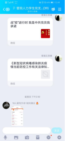 会上,王思惠首先解读了当前疫情情况,带领全体党员学习了习近平总书记关于疫情防控工作的重要讲话和重要指示批示以及中共中央印发的《关于加强党的领导、为打赢疫情防控阻击战提供坚强政治保证的通知》、中共安徽省委组织部《关于为打赢疫情防控阻击战提供坚强组织保证的通知》等文件精神。接着,王思惠强调要时刻注重日常预防,并向大家介绍了九个新型冠状病毒感染的肺炎公众预防指南。随后,全体党员以年级为单位设立党小组,分别就个人在疫情防控工作中的做法以及对此次疫情防控工作的看法做了交流发言,并承诺会在QQ、微信、微博等平台发表宣誓或者进行科普宣传。