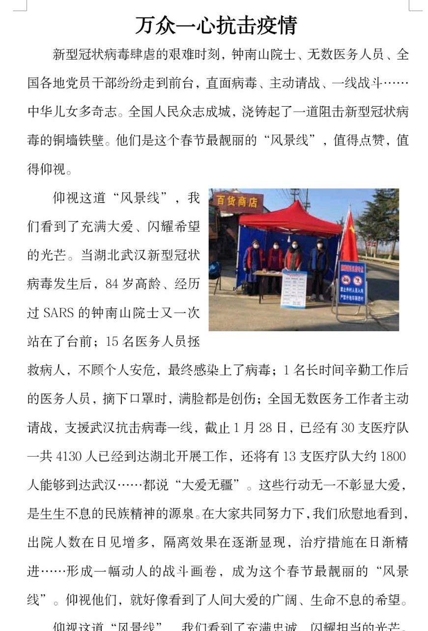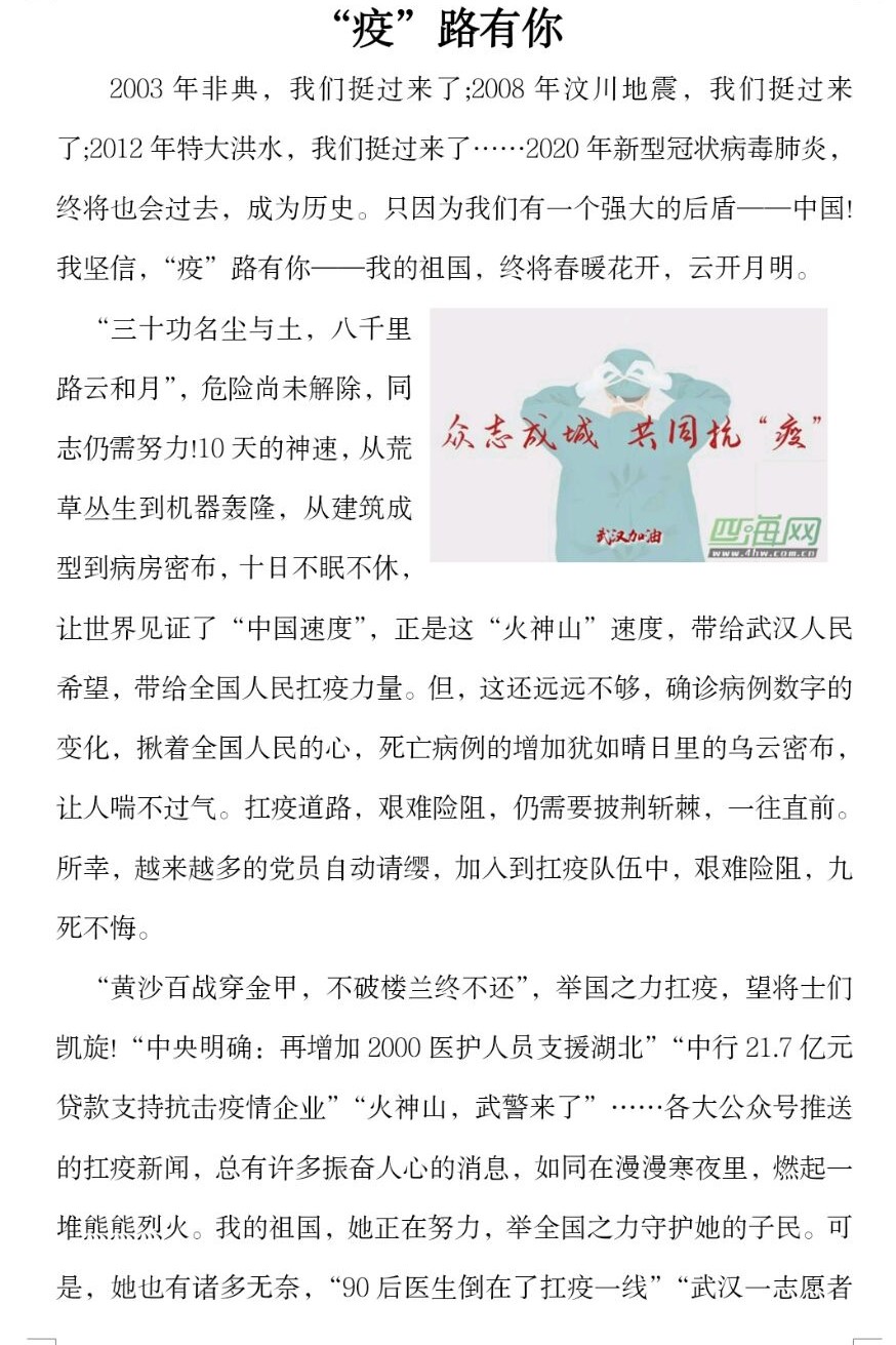 本次活动虽为线上活动,但同学们积极参赛的热情却不减。活动过程中,同学们积极查阅资料,收集抗疫过程中那些令人感动,令人热血沸腾的故事,再加上他们动人的叙述,配上图片,一份优秀的作品就此诞生。作品中有人将此次疫情与03年的那场非典联系起来,做了简单的比较;有人把自己与疫情联系起来,说了自己在抗疫期间所作出的贡献;有人将疫情与祖国强大联系在一起,两个月建立几十家医院,震惊世界。在同学们的作品中可以看出他们的用心。