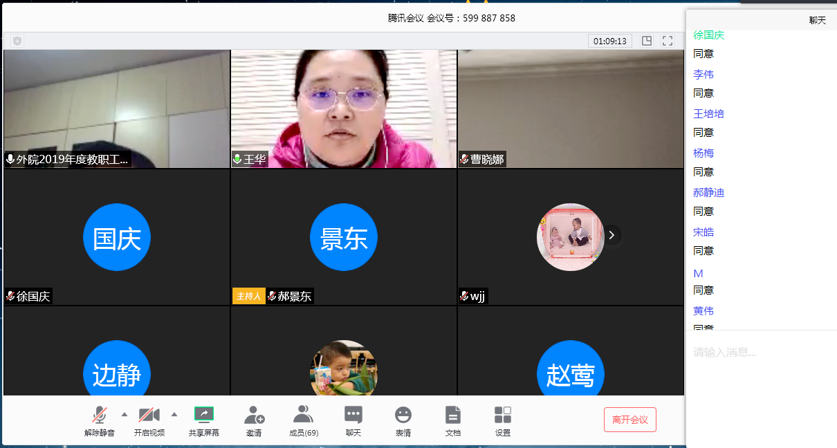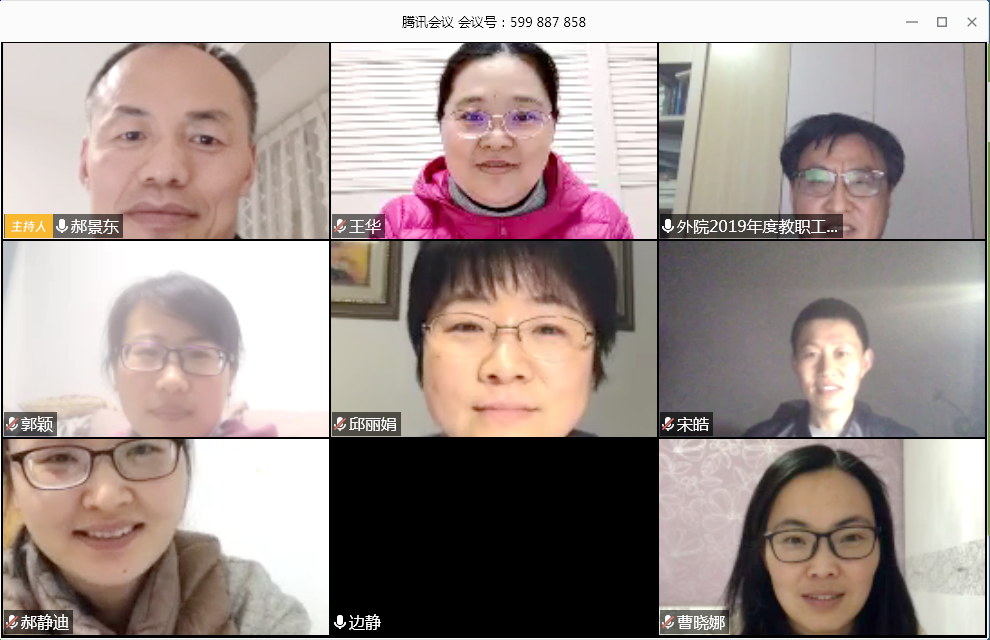 4月3日,外国语学院在利用腾讯会议召开2019年度工作会议,学院负责人王华、李加强、郝景东及全体教职员工参加会议,会议由学院党总支副书记、副院长郝景东主持。