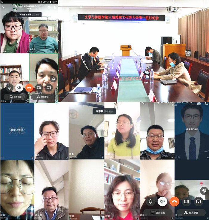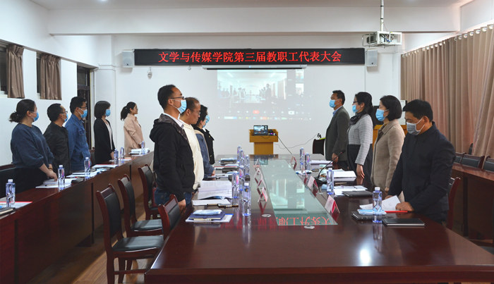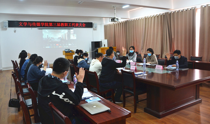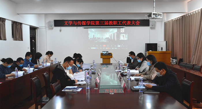 4月8日下午2:30,文学与传媒学院在东教A303召开第三届教职工代表大会,文学与传媒学院党总支书记李月云、院长蒋宗霞、副书记王绍卫、副院长张德岁、院工会主席张琳及全体教职工参加此次会议。会议由李月云主持,通过线上线下形式召开。
